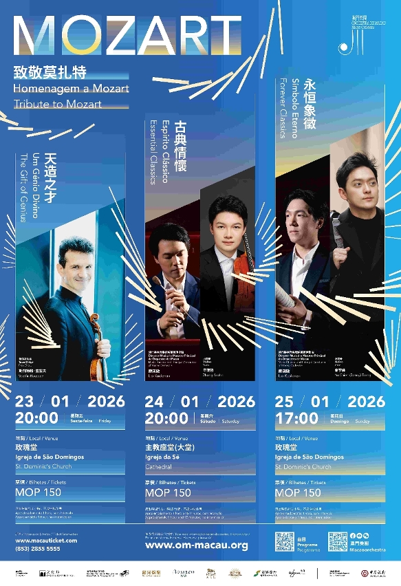 澳门乐团2025-26乐季之“致敬莫扎特”系列音乐会,将于2026年1月23日至25日在玫瑰堂及主教座堂举行,分别由3位国际知名小提琴家演绎莫扎特早期至艺术巅峰时期的经典作品,引领乐迷跨时空感受“音乐神童”作品的生命力与美感。音乐会设演前导赏、大师班及交流见面会等延伸活动,让乐迷近距离与艺术家互动交流。