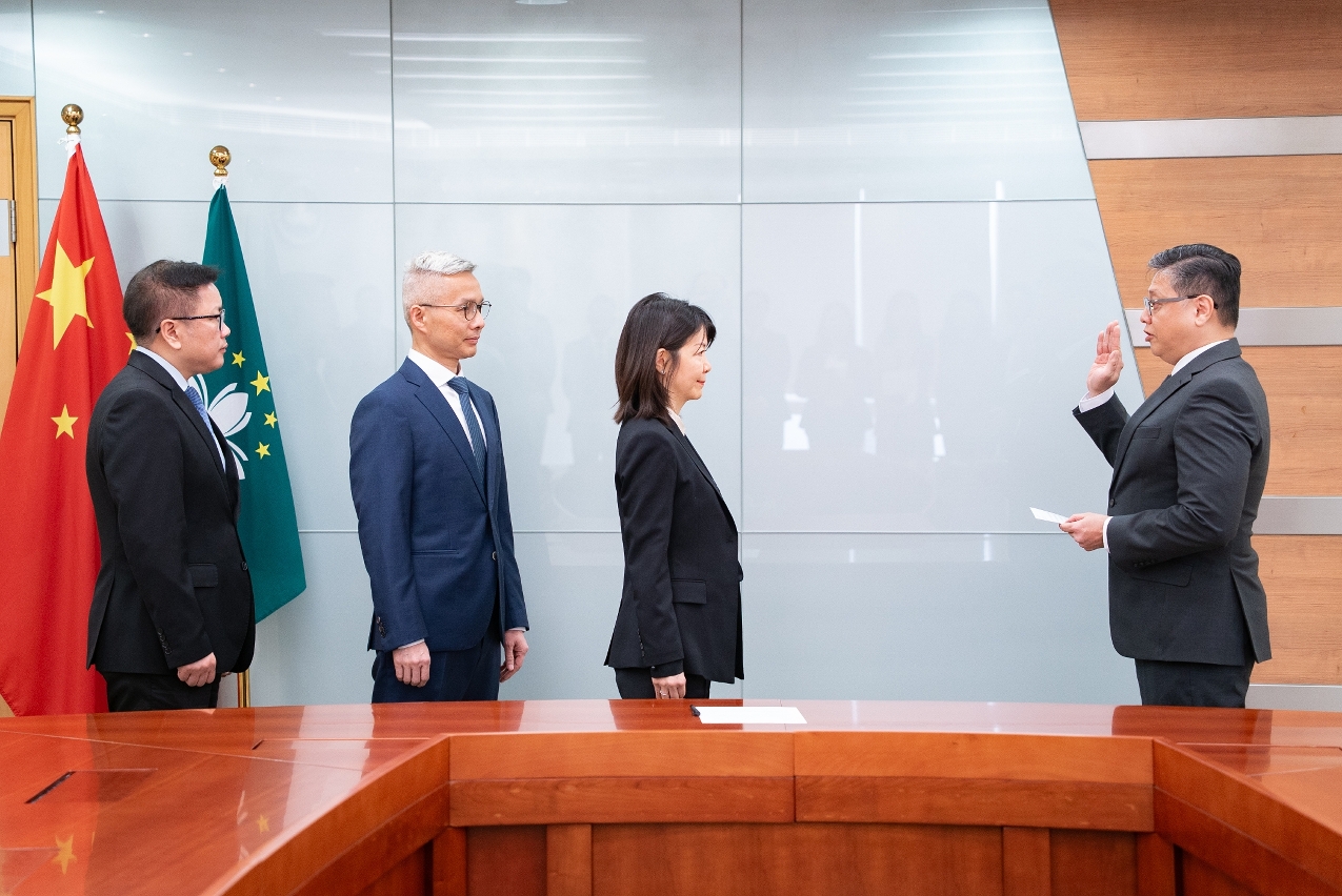 财政局局长何燕梅及副局长郭日海今(5)日就职,仪式由经济财政司司长戴建业主持,及经济财政司司长办公室主任罗志辉见证。