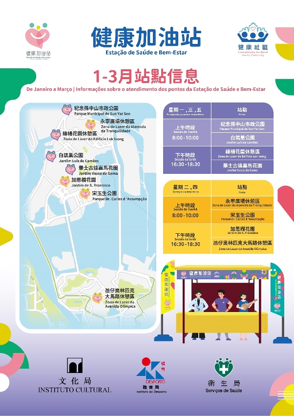 随后,一众嘉宾前往现场设立的“健康加油站”,了解运作情况并与居民互动交流,气氛热烈。“健康加油站”首阶段活动于1月12日至3月31日期间,逢星期一至五(政府假日、恶劣天气及维护期间除外)上午8:00至10:00及下午16:30至18:30,于纪念孙中山市政公园、白鸽巢公园、绿杨花园休憩区、华士古达嘉马花园、永宁广场休憩区、宋玉生公园、加思栏花园及氹仔奥林匹克大马路休憩区共八个站点同步开展,敬请留意开放时间。各站配有“健康加油站”横额,工作人员亦会佩戴相关胸针,以便居民识别。文化局、体育局及卫生局将分别派出“文化传播员”、“健身指导员”及“健康促进员”,为居民提供文化活动指导与资讯、个性化科学运动指导、免费血压测量、健康资讯与评估,并协助预约卫生中心医疗服务,包括疾病筛查、疫苗接种、心理评估等多项内容。