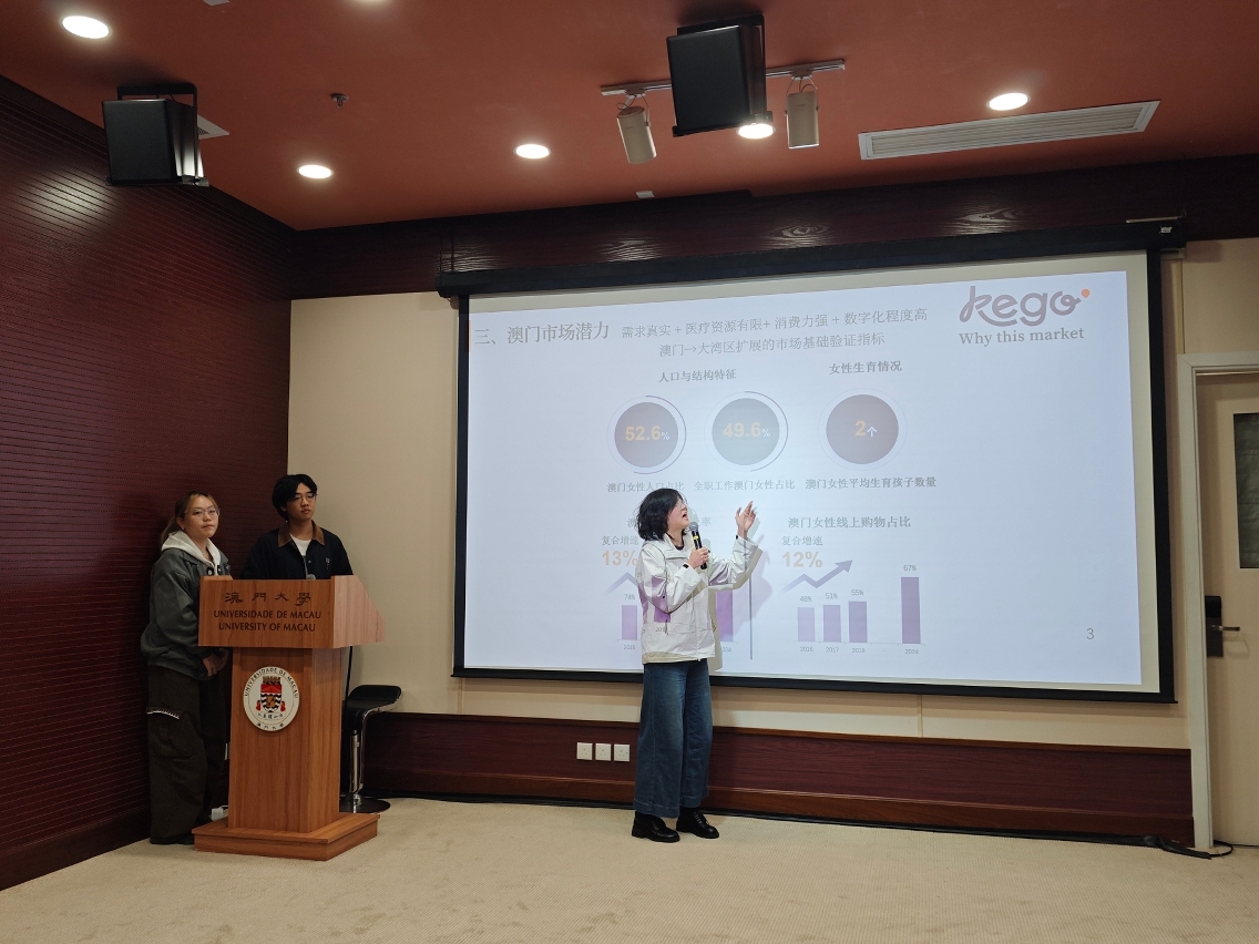 培训营的学员以不同的创业项目进行比拼,并由黄承发、前澳门啤酒总经理洪汉杰、香港理工大学应用物理学系高级讲师詹国龙等多位企业代表及专业人士,从创新性、市场潜力、技术可行性、社会价值等方面进行综合评估。最终,由澳大工商管理学院、郑裕彤书院学生杨杨、卢让嘉诚,以及香港理工大学应用物理系学生周致组成的Kego 组所提交的智能盆底肌训练系统项目,凭藉清晰的市场定位及实用价值获得冠军,并赢得由工银澳门赞助的 4,000 澳门元现金奖。该项目聚焦女性健康领域,推动盆底肌修复产品在澳门市场的应用与普及,回应女性在产后康复及健康管理方面的实际需求,展现了创业项目结合社会议题与市场导向的潜力。