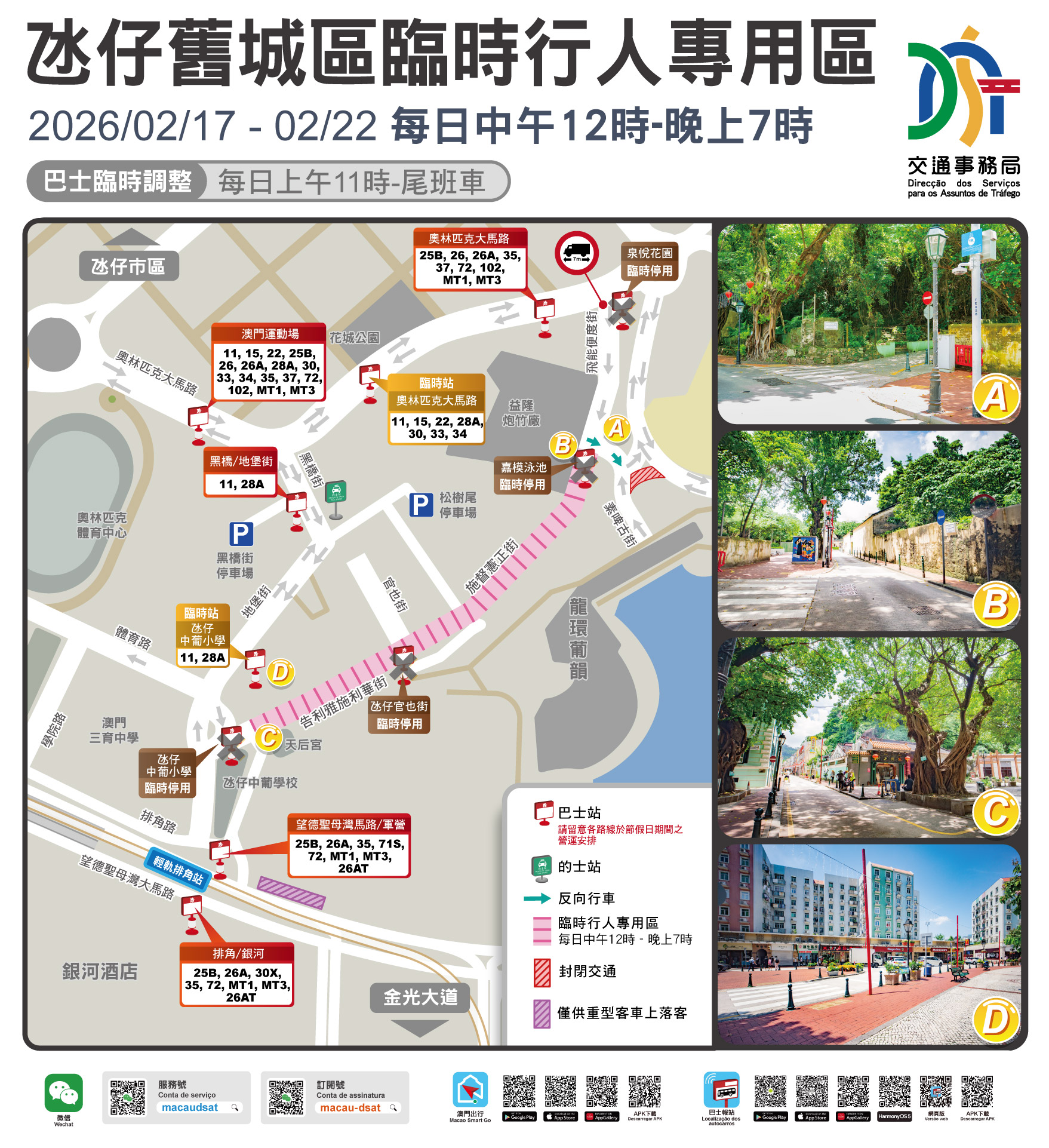 上述期间,氹仔旧城区、关前后街行人专用区范围实施封闭交通,周边部份路段临时调整行车方向,以保持区内交通循环;并会实施禁止车辆停泊、设置临时巴士站、重型车辆临时上落客区等措施: