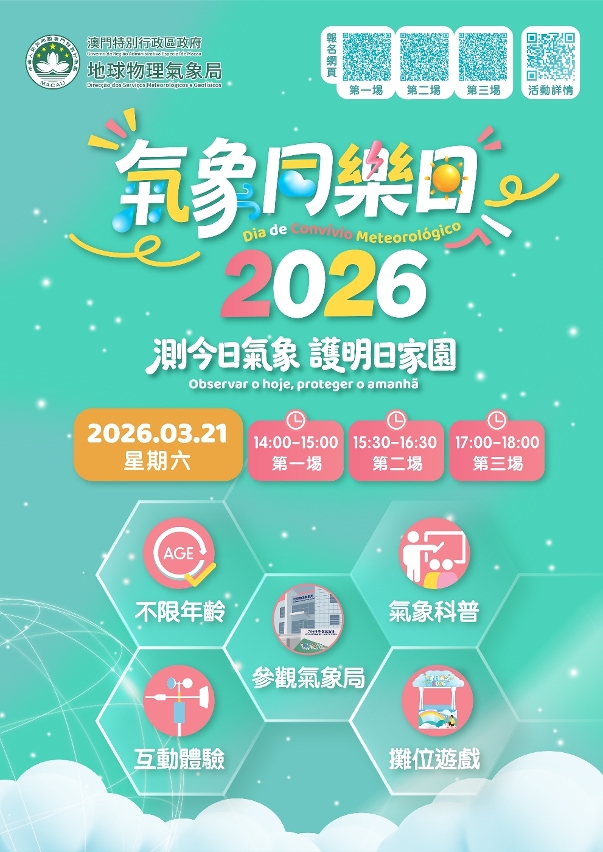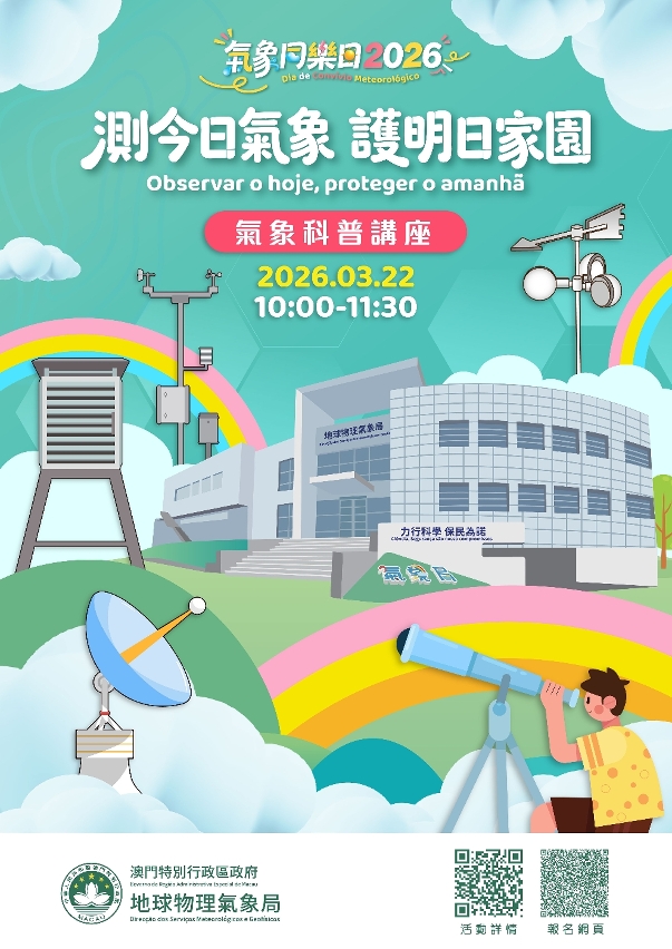 为庆祝3月23日“世界气象日”及加深公众对气象科普知识的瞭解,地球物理气象局将举办面向全澳居民的“气象同乐日”活动,以及面向年满十岁或以上之本澳居民的“测今日气象,护明日家园”气象科普讲座及参观活动。两项活动皆由即日(4日)起至3月9日透过一户通的“活动报名”栏目报名,参加者于活动结束后可领取精美纪念品乙份。欢迎市民踊跃参加,一同体验气象科学的乐趣。