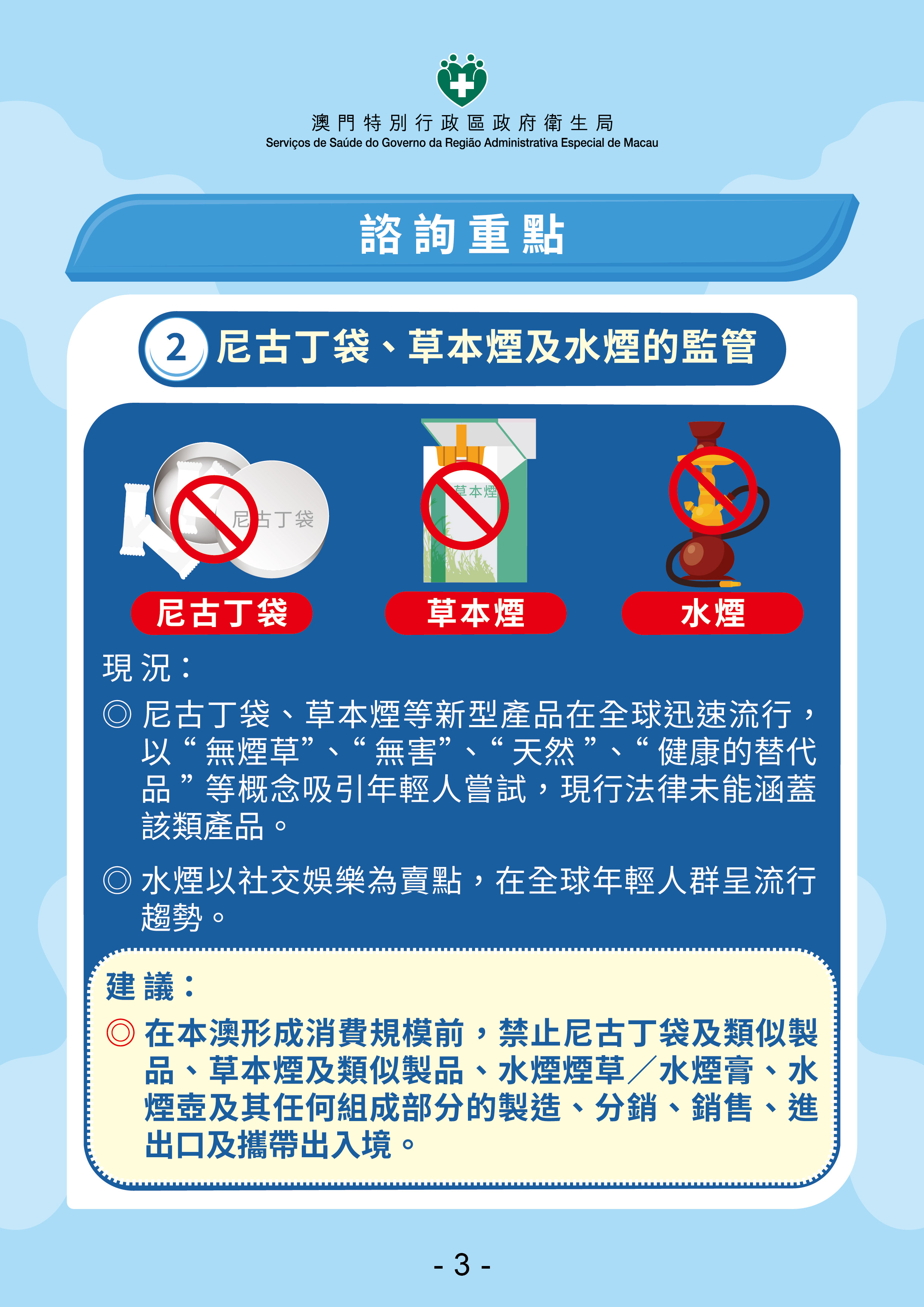 在新闻发布会上郑成业代局长表示,特区政府透过循序渐进方式逐步扩大禁烟范围,加强对电子烟规管,并配合烟害宣传与戒烟服务,相关工作已取得阶段性成效。数据显示,本澳整体吸烟率及青少年烟草使用率均呈下降趋势,更提前实现世界卫生组织订“烟草使用率相对减少30%”的目标,反映现行控烟政策方向正确。随着居民日益关注“边行边吸烟”(俗称“火车头”)等室外吸烟行为所带来的困扰,加上电子烟、尼古丁袋、草本烟及水烟等新型烟草产品逐渐流行,对青少年健康构成潜在威胁,居民对完善《控烟法》的诉求不断上升。