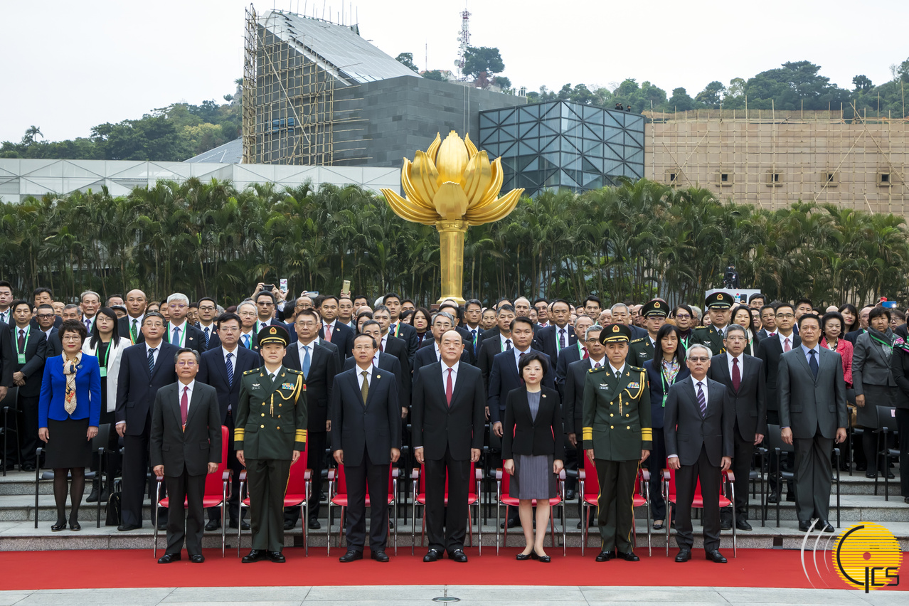 行政長官、特區主要官員、中央駐澳官員、解放軍駐澳部隊軍官及各界人士出席慶祝中華人民共和國澳門特別行政區成立20周年升旗儀式。
