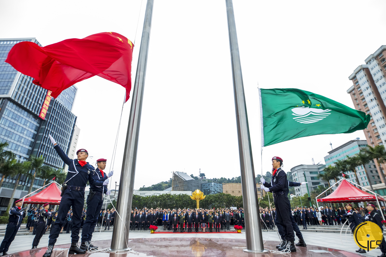 特區政府在金蓮花廣場舉行隆重的升旗儀式,慶祝中華人民共和國澳門特別行政區成立20周年。