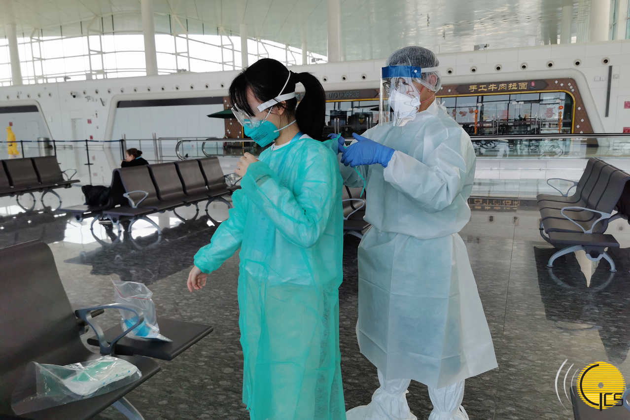 穿上保護衣的醫護人員準備對回澳的居民進行檢疫工作