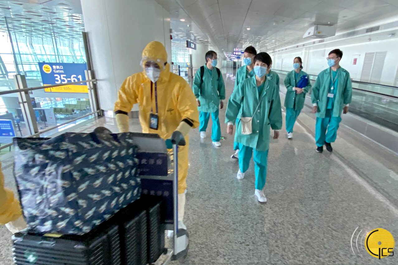 穿上保護衣的醫護人員準備對回澳的居民進行檢疫工作