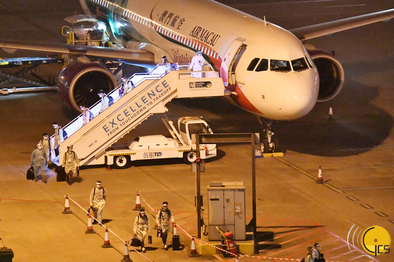 澳門居民分批下飛機,特區政府在各個環節皆採取嚴格措施,包括閉環管理及即時對全體抵澳人員進行核酸檢測。