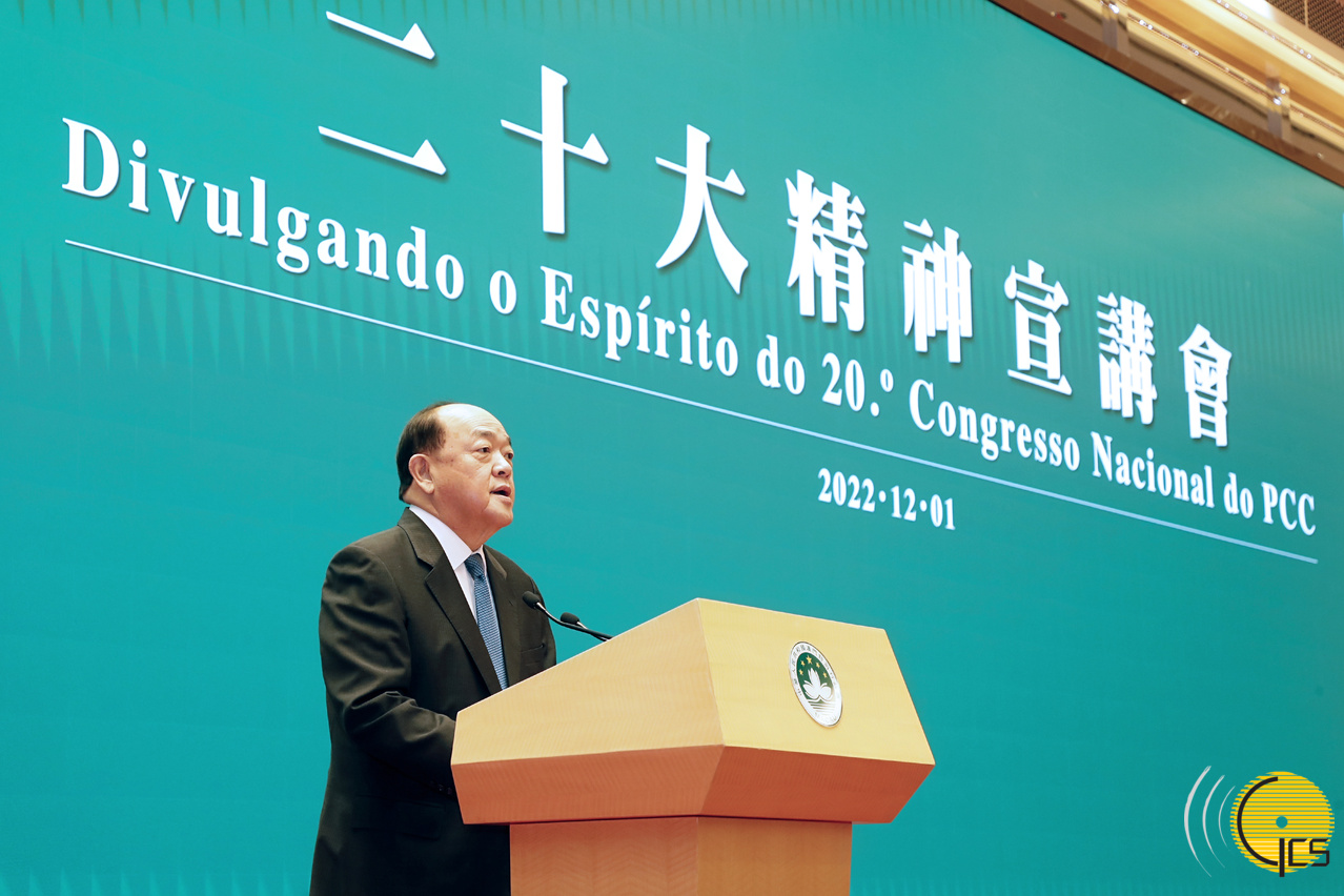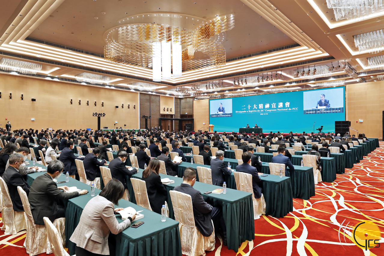 特區政府各主要官員、副局級以上政府官員、行政會委員、立法議員、司法界官員、澳區全國人大代表和全國政協委員等出席首場二十大精神宣講會。
