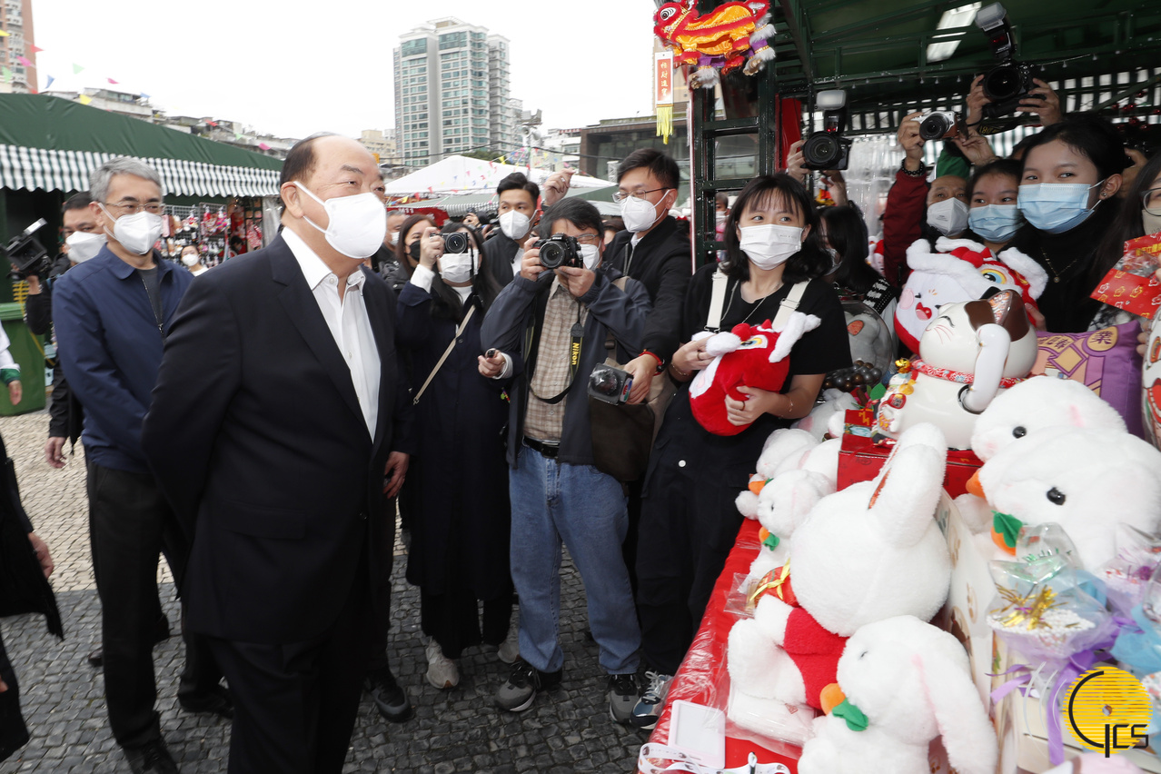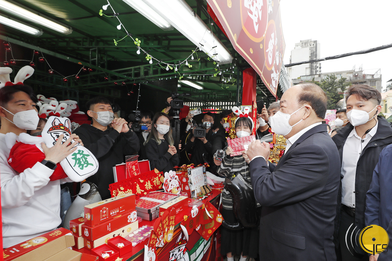 行政長官賀一誠與年宵市場攤位負責人親切交談,瞭解經營情況。