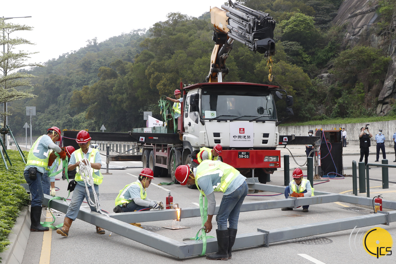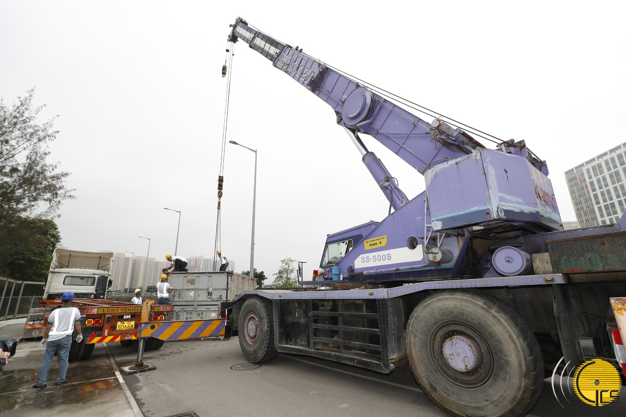 “水晶魚2023”颱風演習-治安警察局協調建築工程公司工程車及人員移走主幹道的貨櫃。