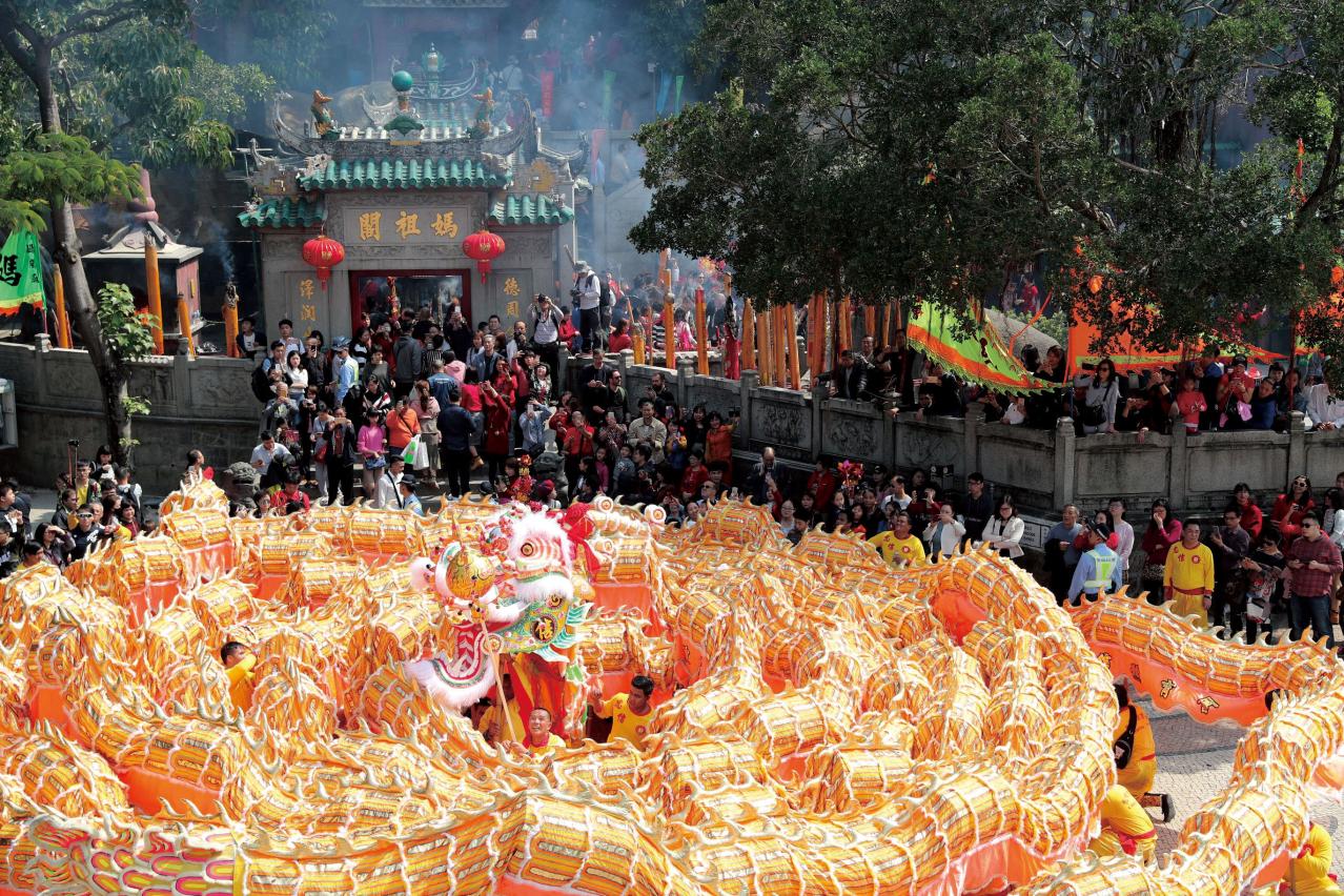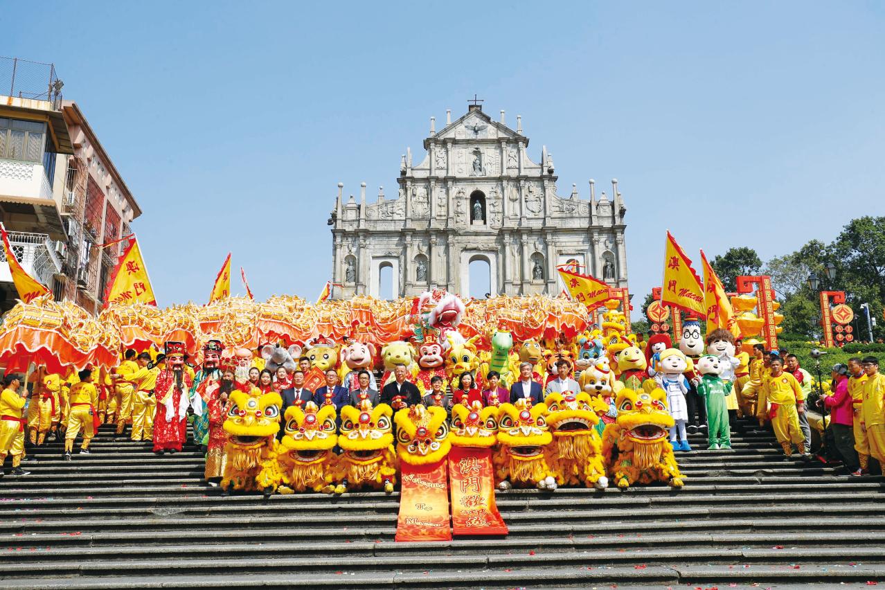 大年初一,全長238米的金龍與伴隨的醒獅,在多個主要景區巡遊,沿途向市民及遊客拜年,寓意澳門在狗年充滿朝氣活力,發展更上一層樓。