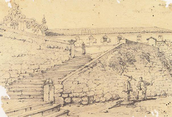 最後簡單介紹崗頂前地的改變,據錢納利的繪畫及1838年完成的澳門城市圖,在崗頂劇院興建之前,聖奧斯定教堂修院旁邊建有一段大型戶外石階梯通往龍嵩正街,該階梯在劇院建造時被改為斜坡馬路,其開路的年份仍刻在路旁的圍欄石上。