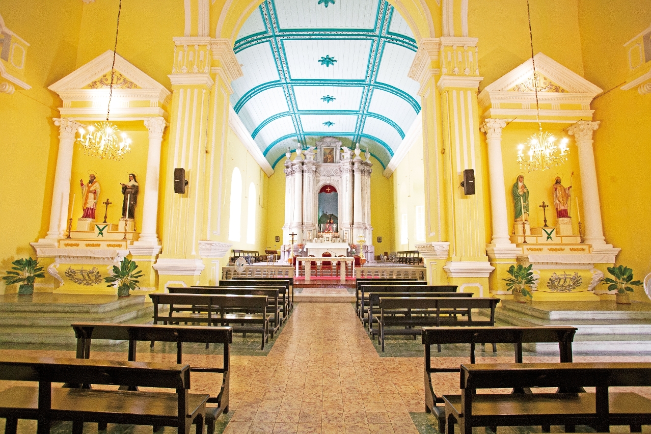 至於內部設計,教堂正廳為一層,入口帶有夾層,上方設唱詩席。教堂內部結構與玫瑰堂類似,採用巴斯利卡式教堂空間佈局,由兩排柱子將空間一分為三,其中中廳寬7米,兩個側廊寬4米,長度均為30米。中廳與兩側廊地面鋪砌水泥花地磚,是19世紀末20世紀初澳門西式建築中常用的鋪地材料,但該教堂地磚的圖案較為特別。