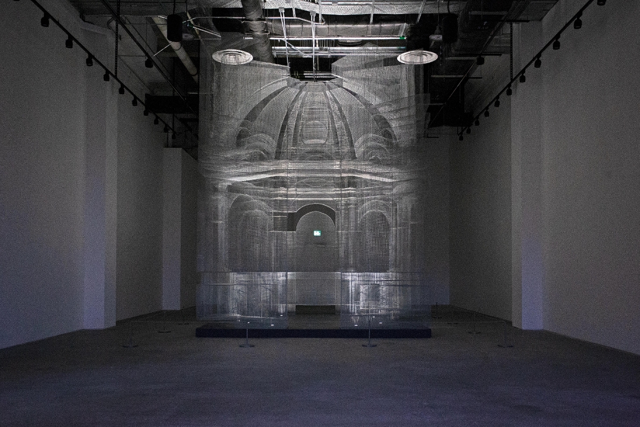 行至展館中段,在幽暗中的《聖禮》,正透過鐵絲網組成的古典建築,表達意大利藝術家艾杜雅多.特雷索迪(Edoardo Tresoldi)對消逝的建築,及應然而變空間的致敬。