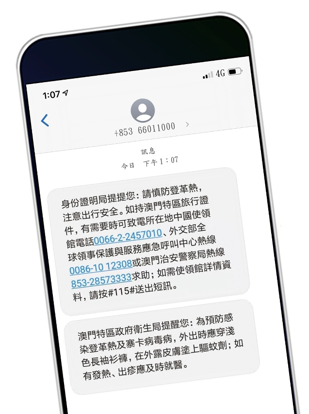 黃寶瑩稱,隨着移動裝置的普及,以此接收資訊的人士越來越多,2006年,身份證明局與澳門的電訊公司推出「領事保護短訊」服務。當使用澳門電訊公司的用戶入境其他國家時,便會收到一則「安全提醒」短訊,內容除會列出該國的禁忌事項和常見安全提示外,亦會告知中國駐當地使領館(大使館、領事館)的聯繫方式,提高澳門居民防範外遊風險意識。