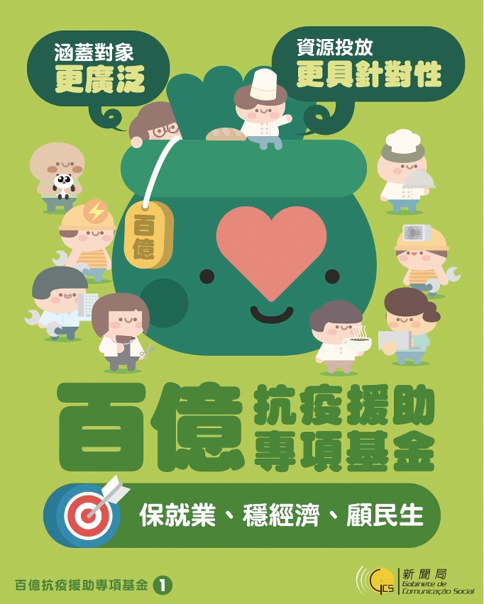 因應疫情對澳門各行業及市民造成的經濟影響,特區政府推出一系列紓困措施,除了提前於4月發放現金分享款項,還包括減免稅費、支持信貸、鼓勵消費等,涉及金額將近400億元(澳門元,下同)。特區政府透過澳門基金會,設立一項規模為100億元的抗疫援助專項基金,對受疫情影響而在生活或經營上有困難的澳門居民和企業商戶提供援助,以及對防疫抗疫工作給予財政上更有力、更快捷的支持,務求做到急市民所急,穩定澳門經濟,保障民生就業。