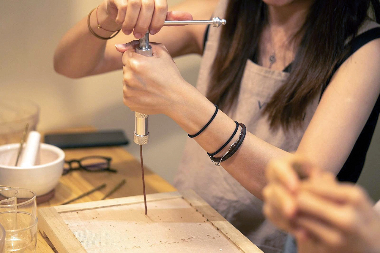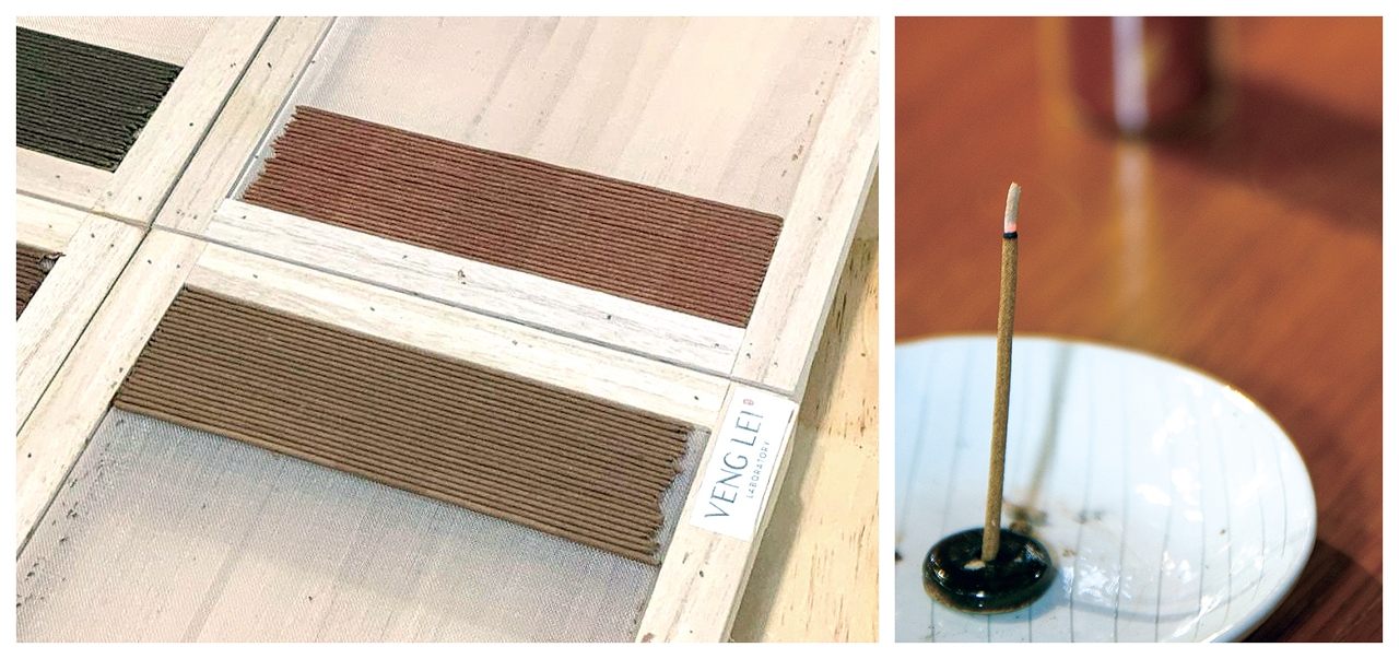 「我們的手作線香工藝雖與傳統神香相近,但也有一些特點。神香不是氣味合香,而是講求速度及產量,不怕日照,能夠大量生產,而且結構底部有竹籤,焚燒味道很重。線香的核心重點是合香,在製作過程中須按照比例調配香料,而且須保持溫度及濕度,否則會影響線香的氣味。」黃競時說。