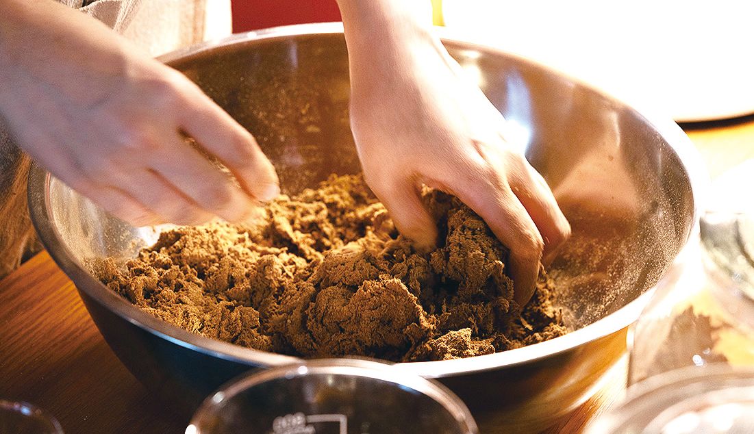 當香粉合成後,要按比例加入水和黏粉搓成香泥團,再反覆搓揉、摔打,使各種香料充份融合。香泥團糅合完成後,需要靜置一段時間,完成「醒泥」階段,再把香泥團切成小塊置入模具,擠壓成條狀香泥。此時,線香已初步成形,進入最後的陰乾靜置階段,可將擠壓好的香枝整齊放置在曬香箱上,晾於陰涼處,等待從外到內徹底陰乾。