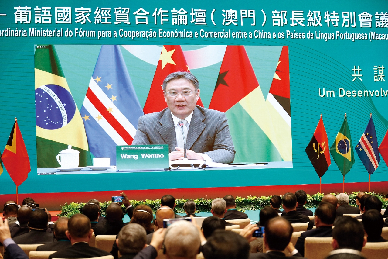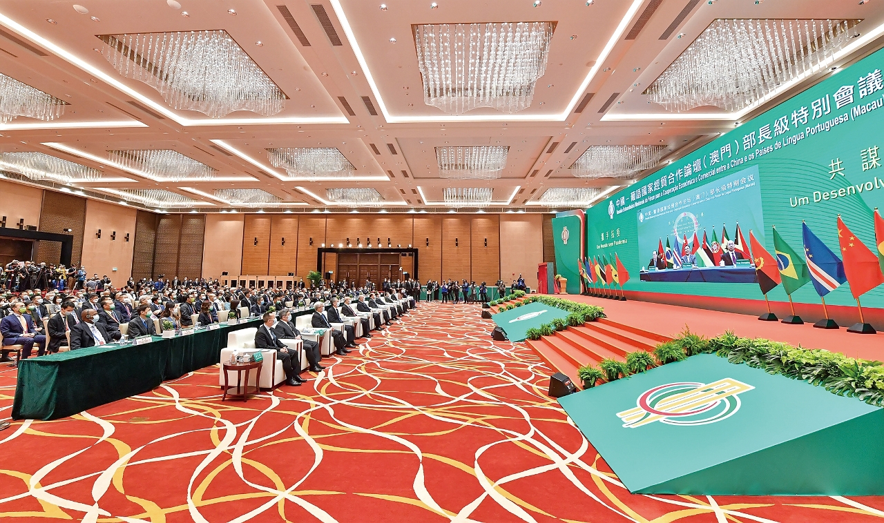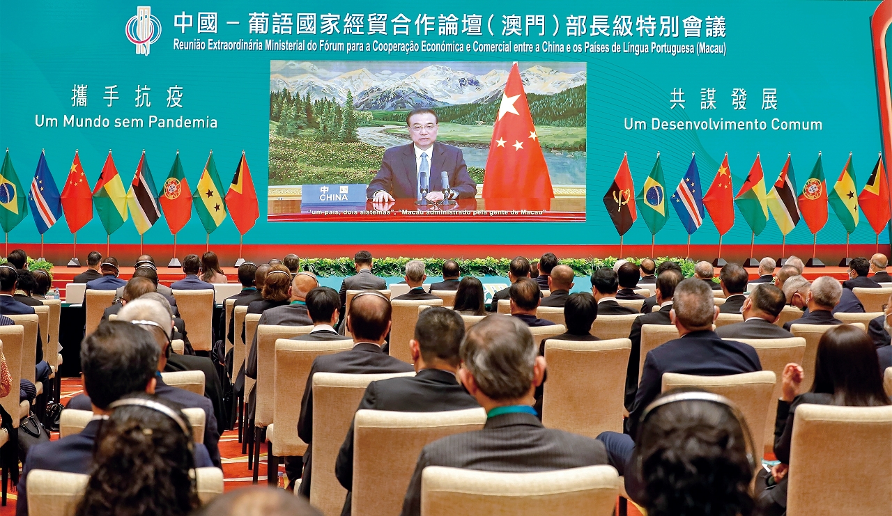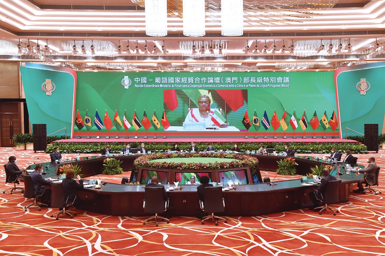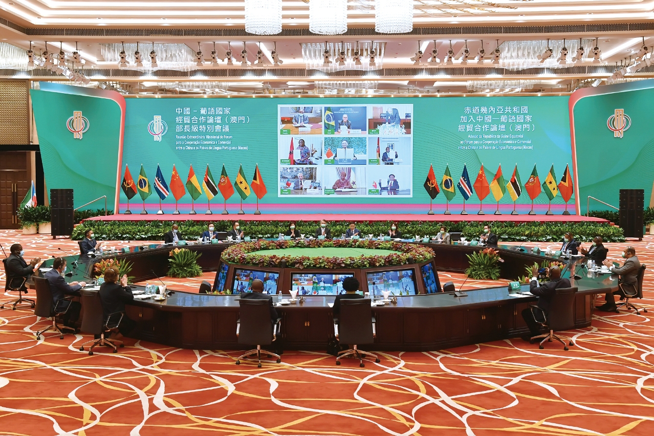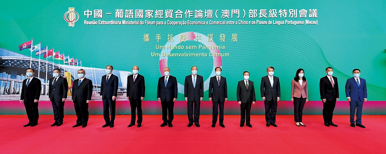 4月10日,由中華人民共和國中央人民政府(商務部)主辦、澳門特別行政區政府承辦、中國—葡語國家經貿合作論壇(澳門)常設秘書處協辦的中葡論壇部長級特別會議,以線上線下結合形式於北京、澳門兩地舉行,主會場設在澳門中葡商貿合作服務平台綜合體。會議以「攜手抗疫,共謀發展」為主題,與會各方聚焦防疫領域的經驗交流、人員培訓與合作,共同探討如何利用澳門平台作用,推動疫後經濟復甦。