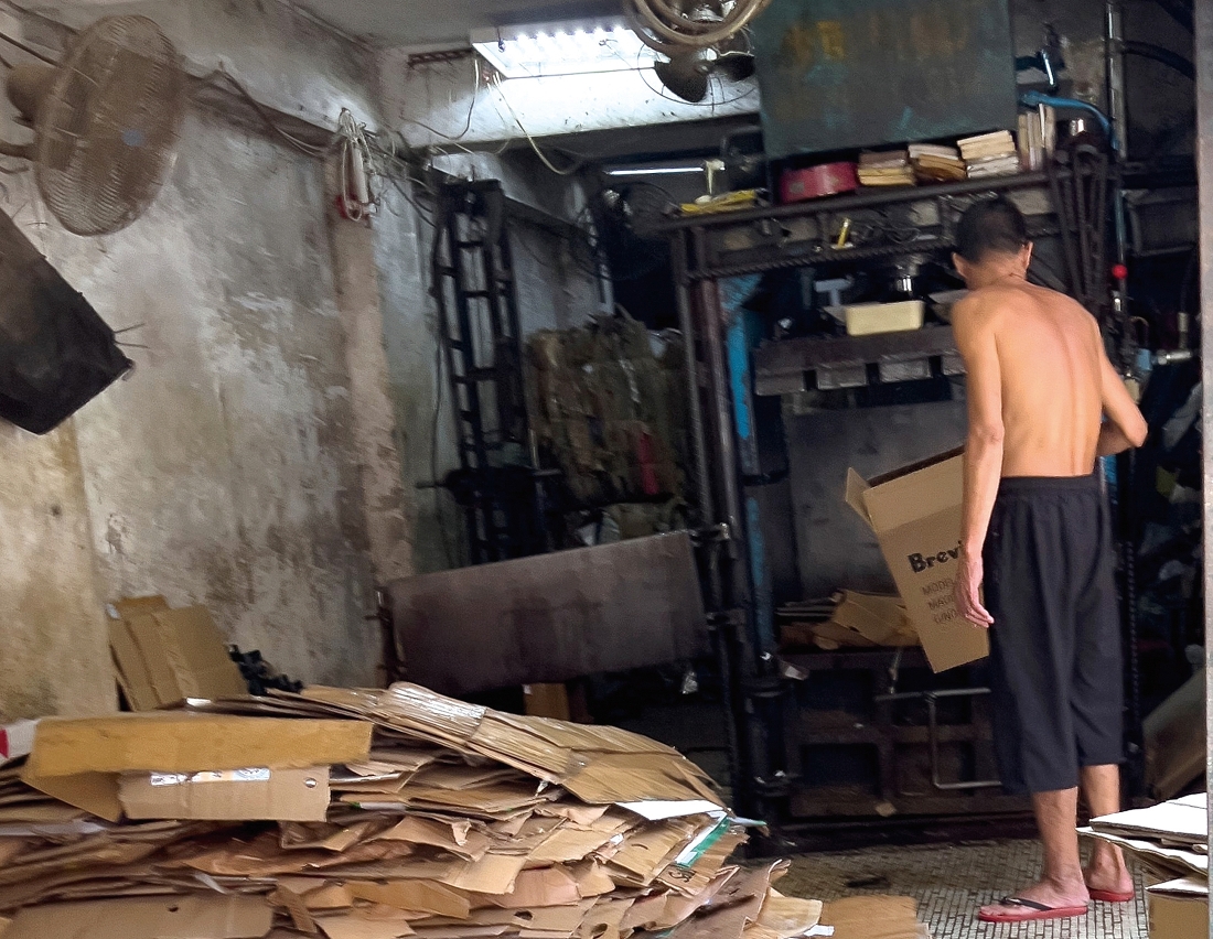 • 專門回收廢紙的店舖員工,正在處理廢棄的包裝紙皮。