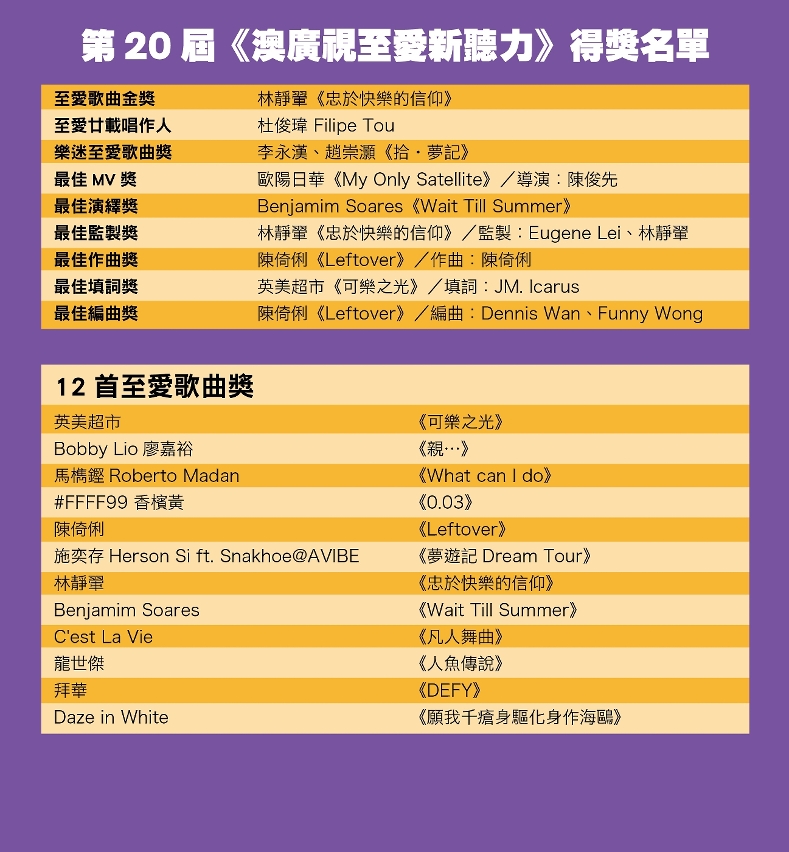陳國威補充,《亞廣聯電視歌曲節》(ABU TV Song Festival)每年透過澳廣視,邀請《至愛新聽力》得獎者參與盛會,代表澳門到東京、土耳其等地演出。「同樣地,澳門歌手亦須努力自行爭取各大演出,增進自己的表演能力,即使同場表演的有樂壇巨星,澳門歌手站上台也不輸給他們。」他強調,澳門音樂看似仍在起跑線上,但每首原創歌曲的背後,都是音樂人們的共同努力。
