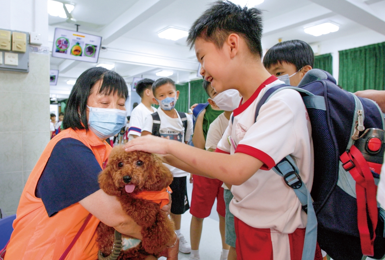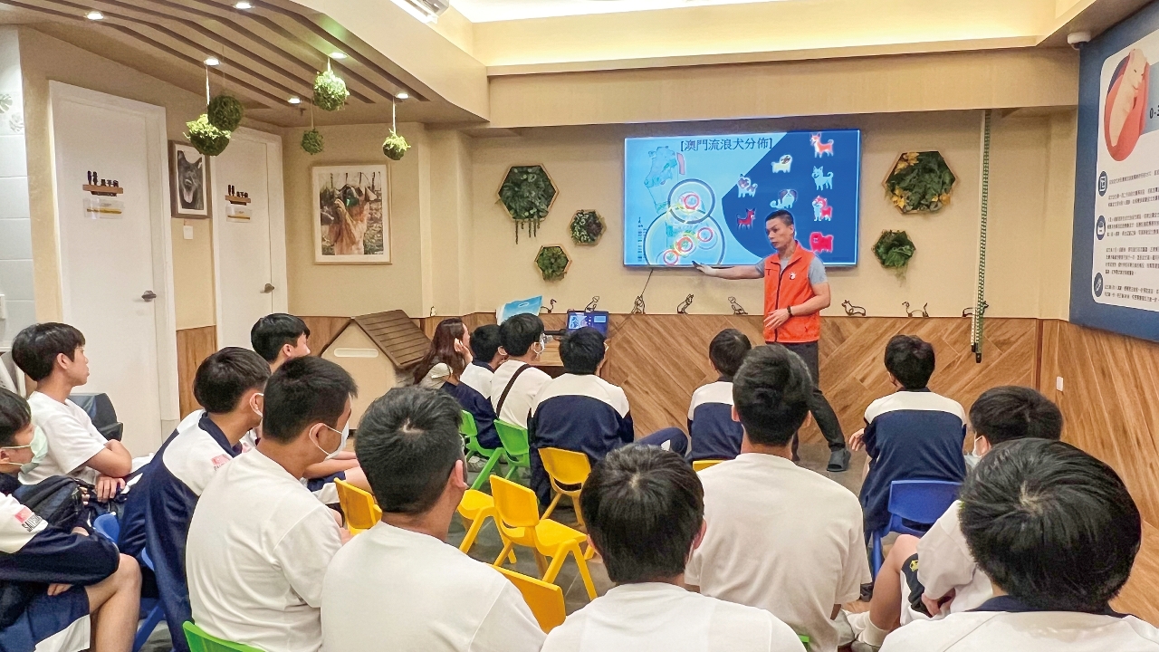 愛護動物,人人有責。除市政狗房,坊間亦有一些拯救流浪動物的動保團體,人人流浪狗澳門義工團(下稱「義工團」)正是其中之一。義工團主席陳燕清(外號「Happy媽」)和義工牽着4隻穿着尿布的小狗走進校園,牠們昂首闊步,充當義工團與市政署合辦的生命教育講座小助手,與校內學生互動,藉以宣揚正確的養寵知識及飼主責任。