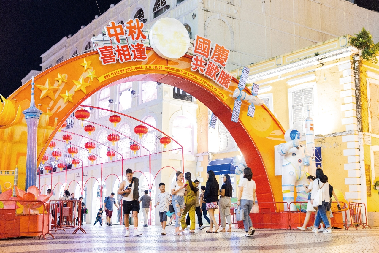 臨近中秋和國慶,澳門特區政府已於各主要街道、廣場、公園、圓形地及富有特色的建築物佈置節日燈飾,為佳節增添氣氛。