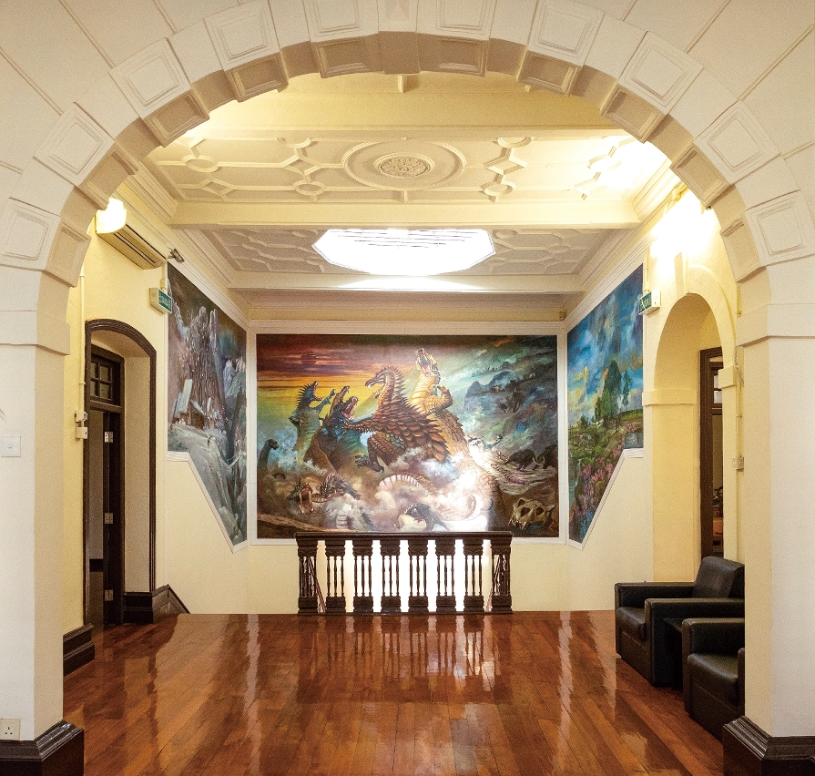 約十年前,筆者參觀大樓時,區金蓉校長特別介紹了在樓梯牆壁畫有恐龍的油畫,畫角簽名處有紅色的梅花與白色天字組成的符號。校長說是出自一位著名的畫家梅與天(梅雨天)。幾年前,香港皇都戲院發現由嶺南畫家梅與天製作的「蟬迷董卓」浮雕,消息令我想起嶺南中學的油畫。