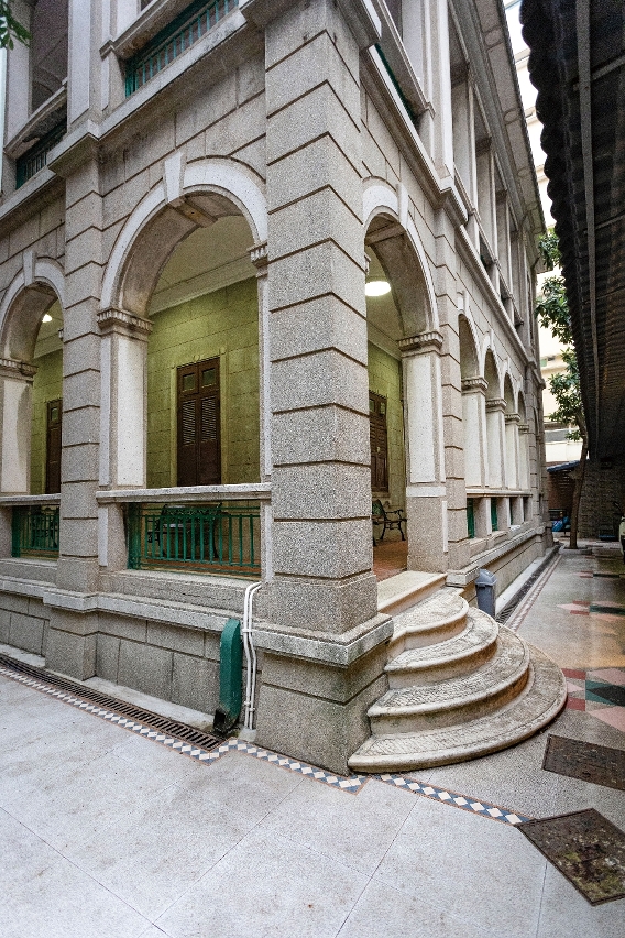整座建築外牆採用洗水石米飾面(又稱上海批盪)以仿效石材建造,這樣的飾面在20世紀前半葉流行於港澳;迴廊鋪地的彩色水泥花磚與彩色馬賽克,亦是當年流行使用的材料。