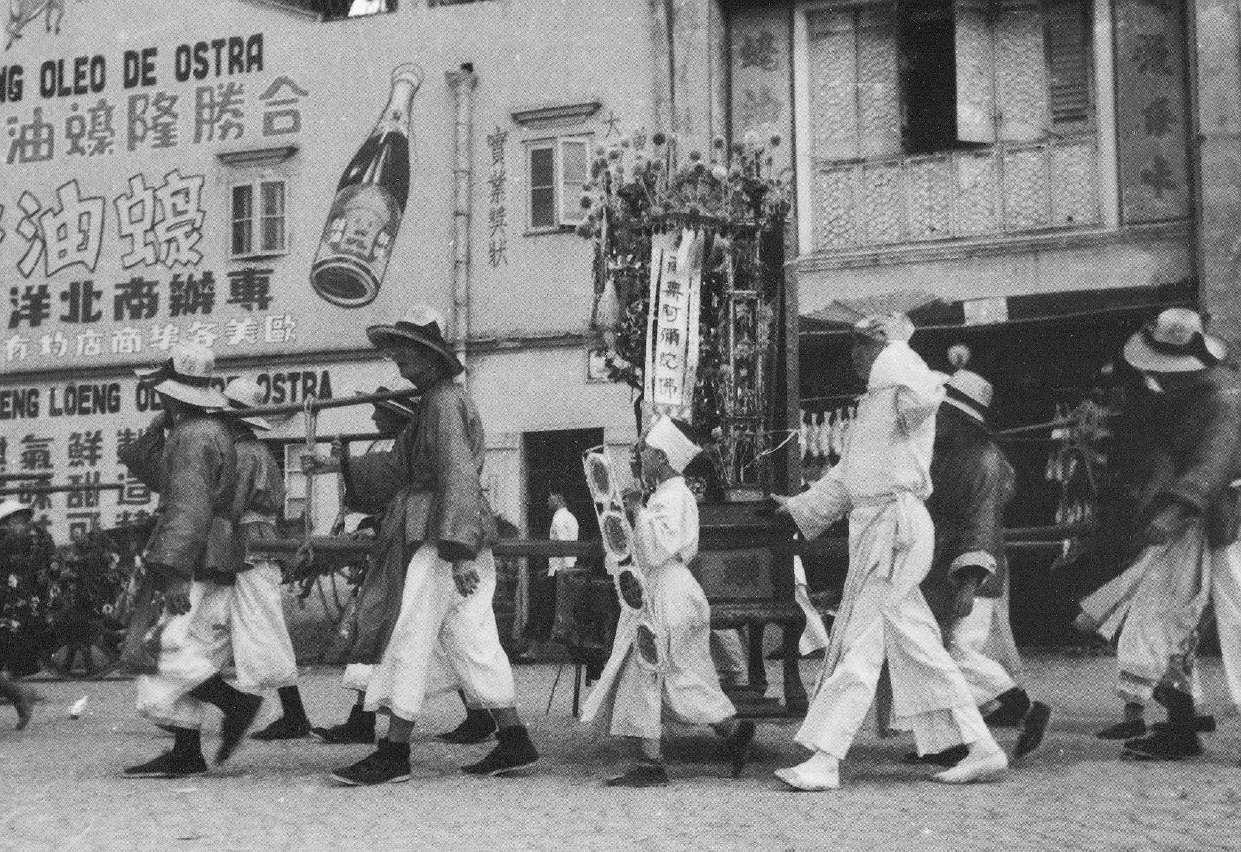 何澄溪先生出殯之事,早在整個澳門街談巷議。當天,筆者特意跑到新馬路與域多利戲院交界之行人路上觀看,剛好看到何澄溪出殯隊伍慢慢走過來。前導之報喪大燈籠、旗幡之後,是幾十人抬、拾幾呎高、裝飾華麗的多層棺槨,還有十多人高舉遮陽擋雨的華蓋。後面是略小於籃球場、用白布圍成的孝幃,裡面該是孝子賢孫及一眾親屬,然後是邊行走邊誦經的僧道尼隊伍,每一隊都有好幾十人。再後是有橫幅前導的各單位送殯隊伍,幾十隊花牌(有放在方桌上兩人肩抬的、有三輪車載的、有手推三角滑輪車的)、邊走邊演奏的中西樂隊穿插其中。龐大的出殯隊伍,加上行人道上的旁觀者,整條新馬路擠得滿滿。我看了大約半小時,還不見「龍尾」,就離去了。後來聽說,送殯者逾萬人(當時澳門人口不到20萬),整個隊伍一個多小時才走完。雖「未窺全豹」,所見的「大陣仗」,已足永存腦海。