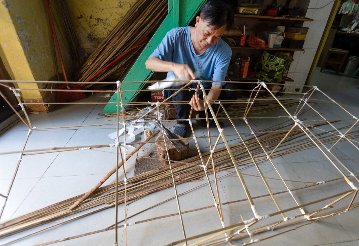 師傅按成品的式樣所需,鋸取尺寸適度的竹竿,再劈出寬厚不一的竹枝和薄薄的竹篾,粗厚的竹枝用作搭建主支架,用竹篾搭建整個產品的「廊」(內框),竹枝、竹篾交接處用紗紙捆實,糊裱紙張(大型作品或須糊裱多層紙張,使之更為結實),最後是加上裝飾或塗彩,就告完成。
