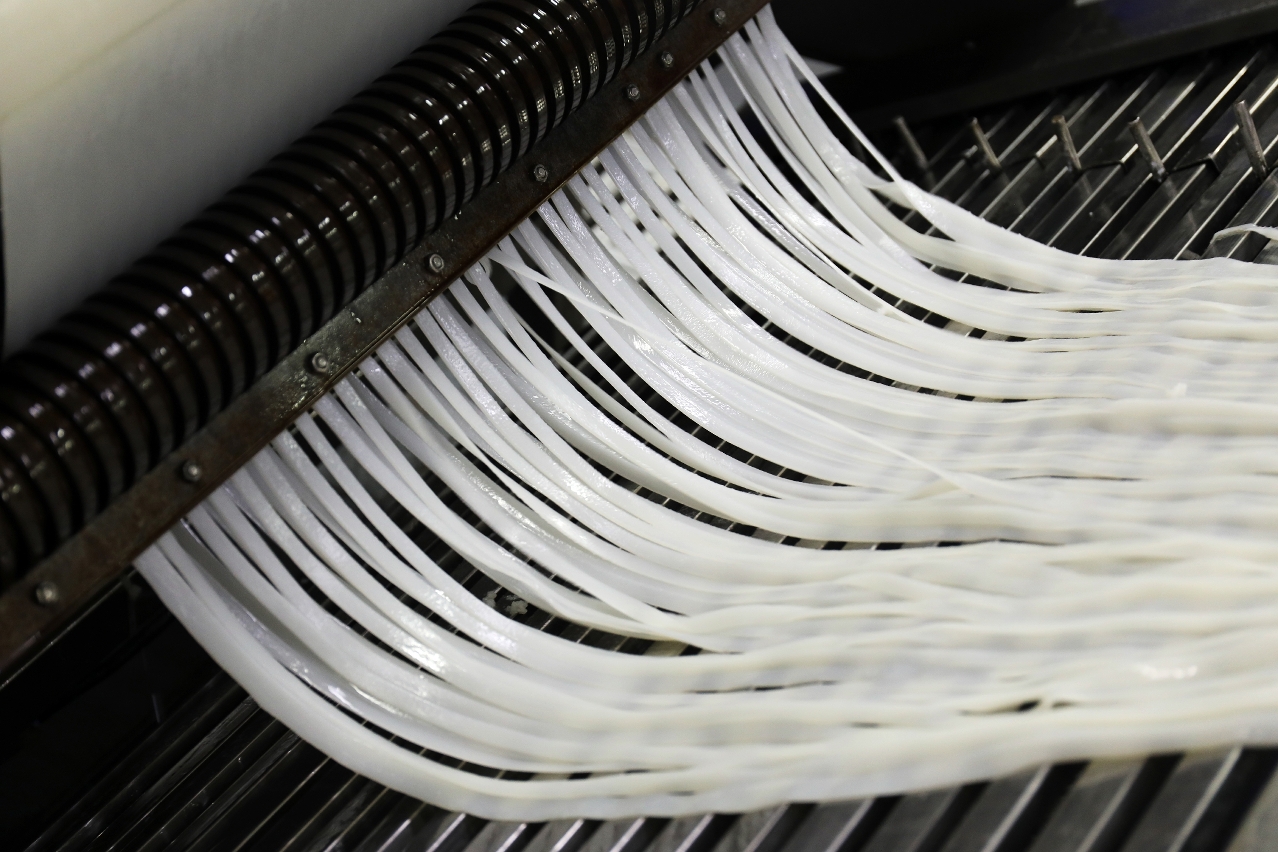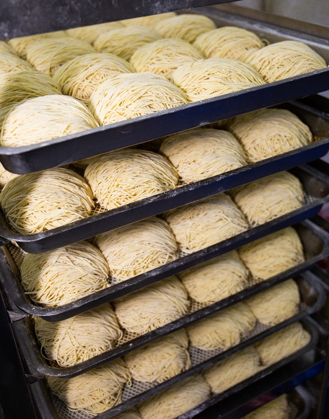 全記營運總監文啓榮介紹,全記麵家由其父親文偉全創辦,當時全舖只有100平方米,以製麵為主,另會製作一些點心供應食肆。「2015年,為擴展業務,我們決定改名及搬遷至現在的青洲廠房,廠房佔地共兩層,其中一層以半手工的生產模式為主,另一層則是全機器生產模式。」