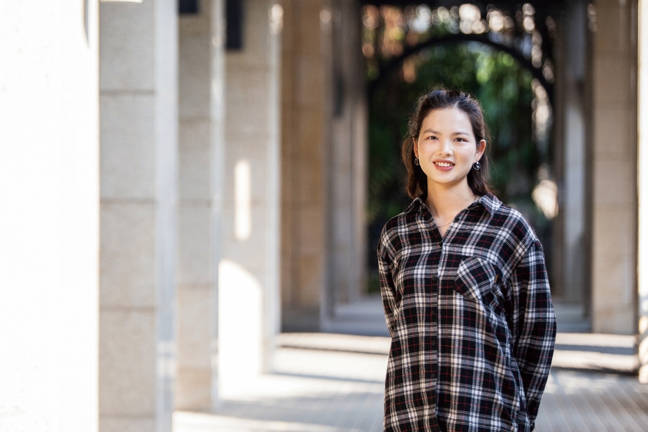 詹睿欣有一雙總是笑瞇瞇的眼睛,現實中也是一個樂觀開朗的女孩。她參加拍攝時是大一新生,「參與《白夜》拍攝,讓我一入學就感受到澳門大學豐富的校園生活,也幫助我快速融入新環境。」雖然沒有任何表演經驗,但劇組中洋溢的自在、寬容氛圍,對她融入角色有很大幫助。「這部電影經常需要在同一個場景出現『女主角』的兩面,需要我和陳嘉嘉輪流拍攝,或做對手戲,展現角色兩面的對抗與掙扎。拍攝時,導演給了我們很大的發揮空間,很多時會讓我們即興構思對白,很好玩。」
