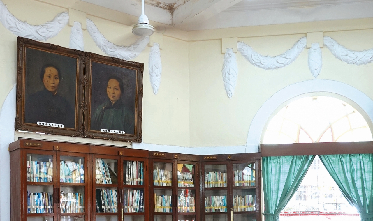 如果在「八角亭」的正門細心觀看,門額上寫着「澳門中華總商會附設閱書報室」,其下有小字「紀念何母鄧、梁太夫人」。