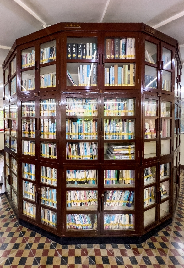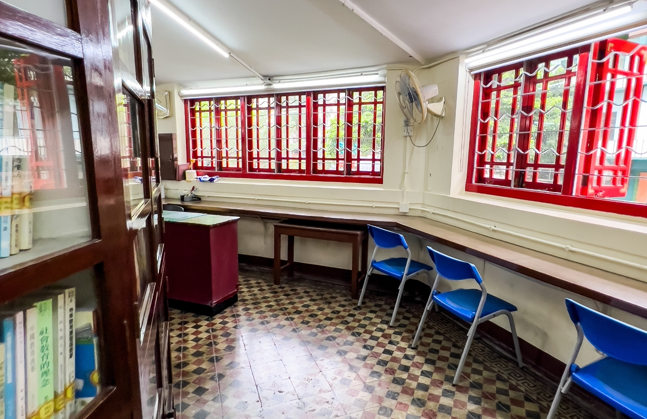 後來因用作閱書報室而作擴建,原本的「八角亭」成為了一樓的管理員室,並在其牆身加設了書櫃。如果細心觀察一樓水泥花磚地面的邊緣,仍能看到昔日天台的排水凹槽,排水管則隱藏在下層外牆的角位處。