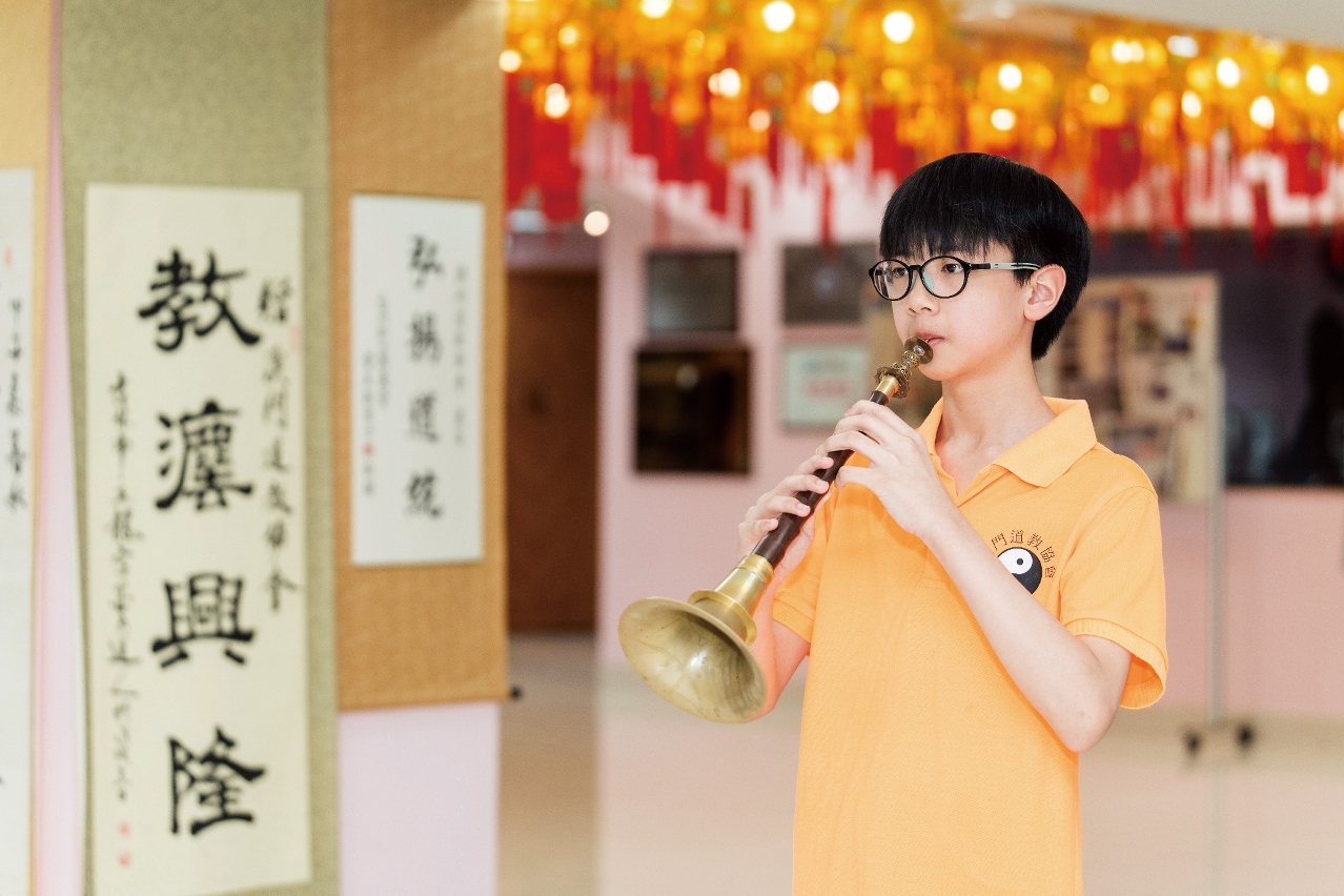 內斂的廖國曦剛放學便來到澳門道教協會會址,換上橙色的會服後,慢慢分享他加入道樂團的故事。「我今年12歲,大約兩年前開始學笛子和嗩吶。」他每星期都會練習3天,包括新曲學習、團練及與鑼鼓合奏。「道樂講究協作,需與鑼鼓默契配合。」他坦言,與鑼鼓合奏頗具挑戰。