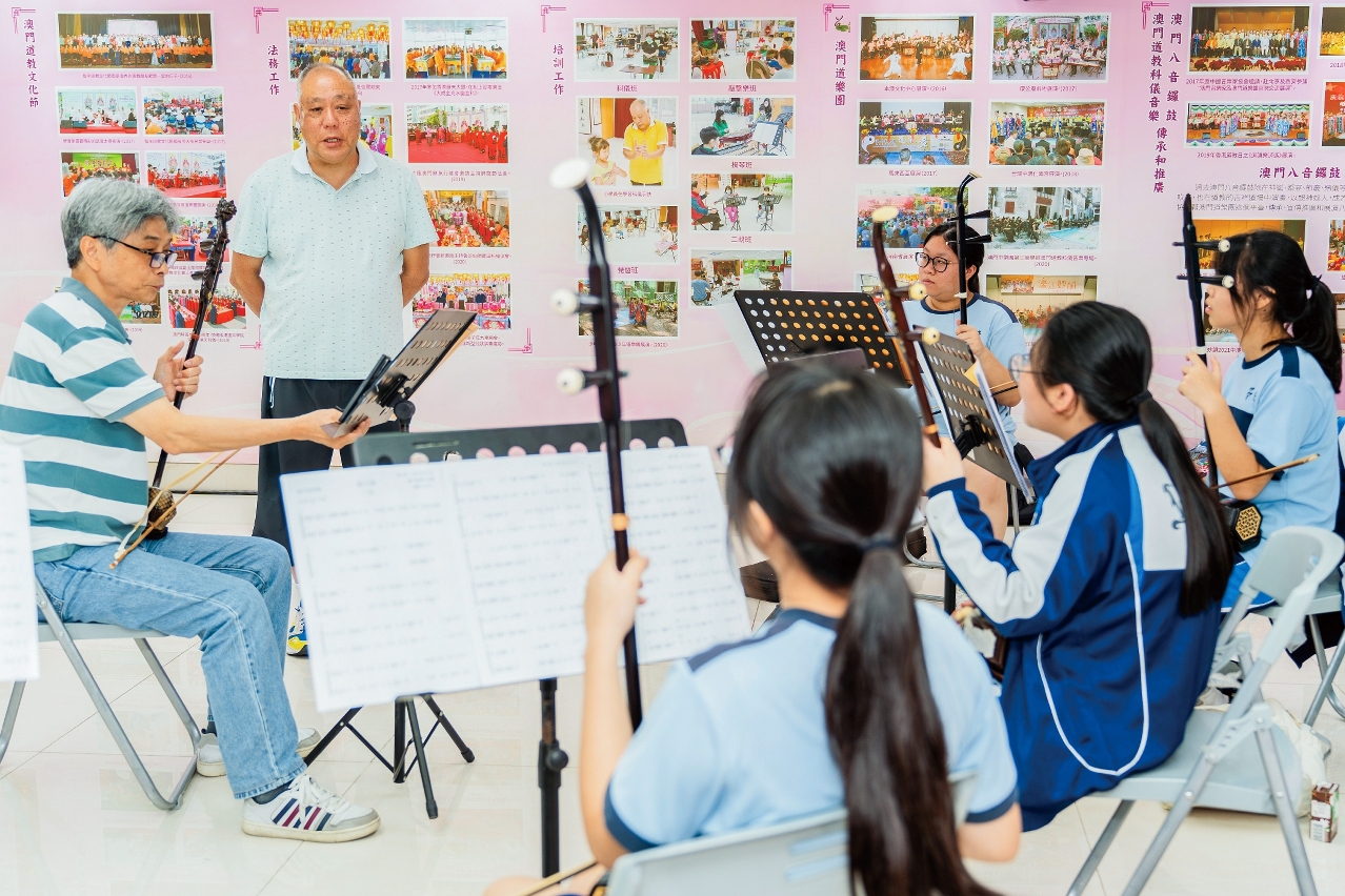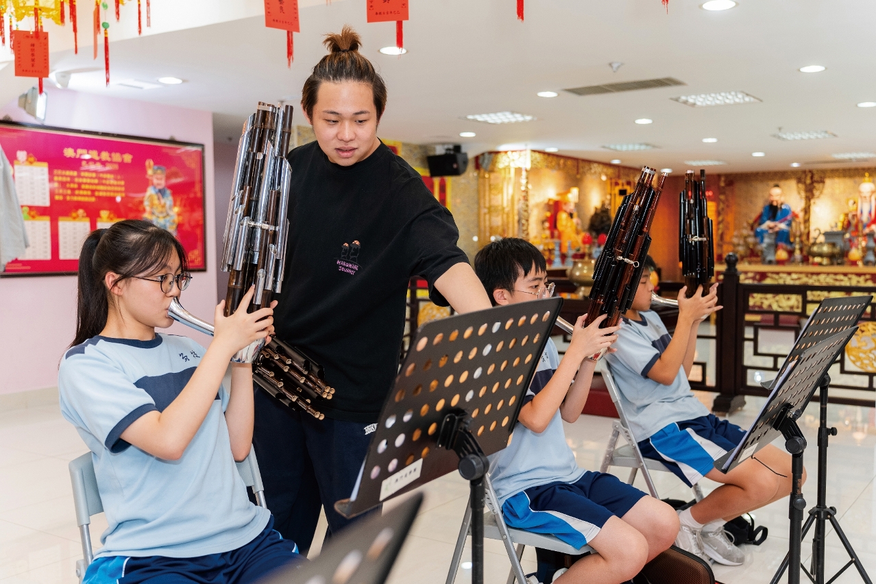 在澳門道教協會與學校合辦的中樂興趣班,吳炳鋕不時與學生交談,鼓勵他們堅持練習,未來加入道樂團。笙導師兼道樂團成員黃鎮業到達協會時,吳炳鋕熱情介紹,原來黃鎮業很早已加入道樂團,學藝逾十年,如今順理成章擔任樂團導師。「最初因學校興趣班愛上中樂,兩年後加入道樂團。」他見證樂團日益壯大,宛如一個溫暖大家庭。