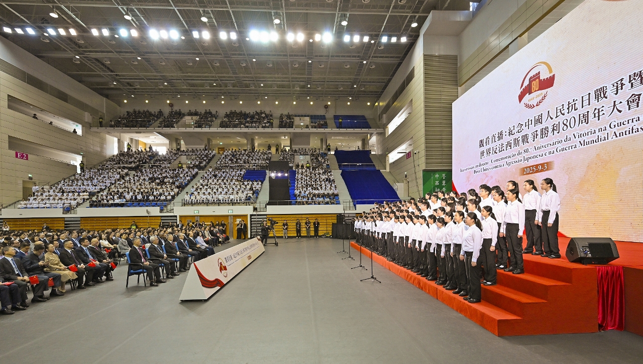 澳門特區政府同步舉行「觀看直播:紀念中國人民抗日戰爭暨世界反法西斯戰爭勝利80周年大會」,號召社會各界,一同聆聽習近平主席的重要講話,以及觀看隆重的閱兵儀式,藉此與祖國人民一起銘記歷史、緬懷先烈、珍愛和平、開創未來。