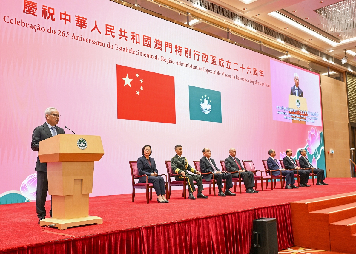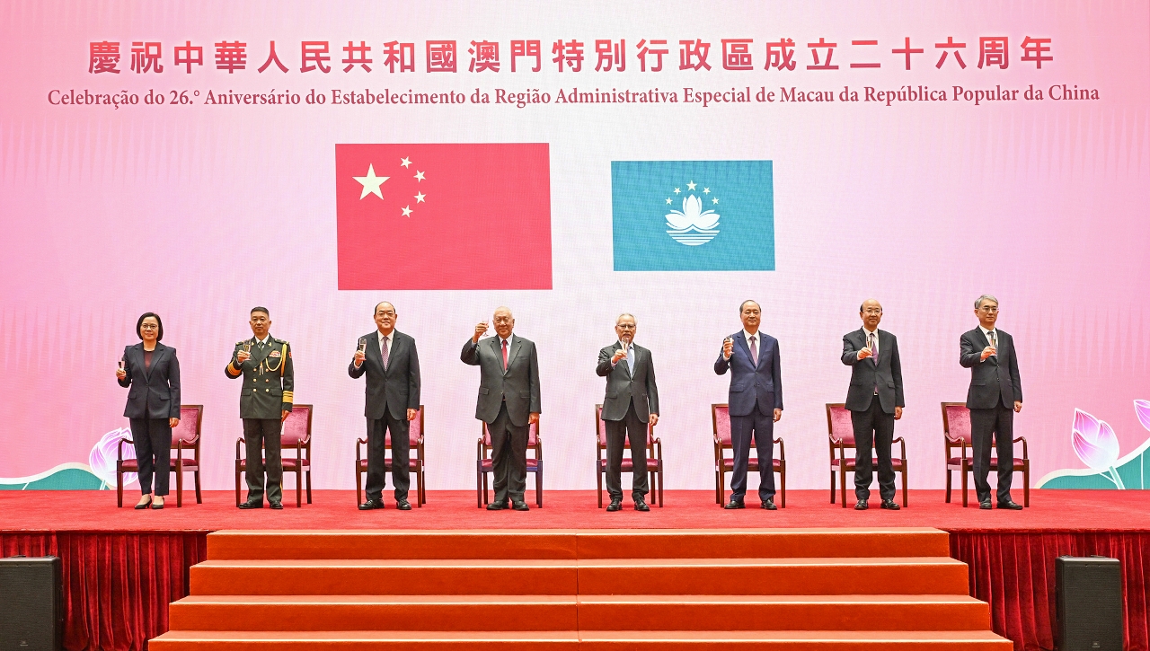 行政長官岑浩輝在慶祝中華人民共和國澳門特別行政區成立26周年招待酒會致辭時表示,二十屆四中全會擘畫了國家發展的新藍圖,中央「十五五」規劃建議對澳門未來發展作出了重要戰略部署,為特區發展提供了新的巨大機遇和政策動能。澳門將遵照習主席的重要指示,更加積極主動對接國家發展戰略,制定好、實施好澳門特區「三五」規劃,在服務強國建設、民族復興的新征程中,實現自身更好發展。