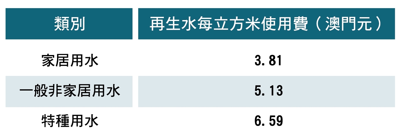 再生水每立方米使用費為相應類別飲用水的85%。為確保珍貴的水資源不被浪費,基於「用者付費」原則,再生水使用費與飲用水價格機制中相應用戶類別的使用費掛鈎,但家居用戶的再生水使用費不設階梯式收費,僅與飲用水第一階使用費掛鈎。再生水使用費如下: