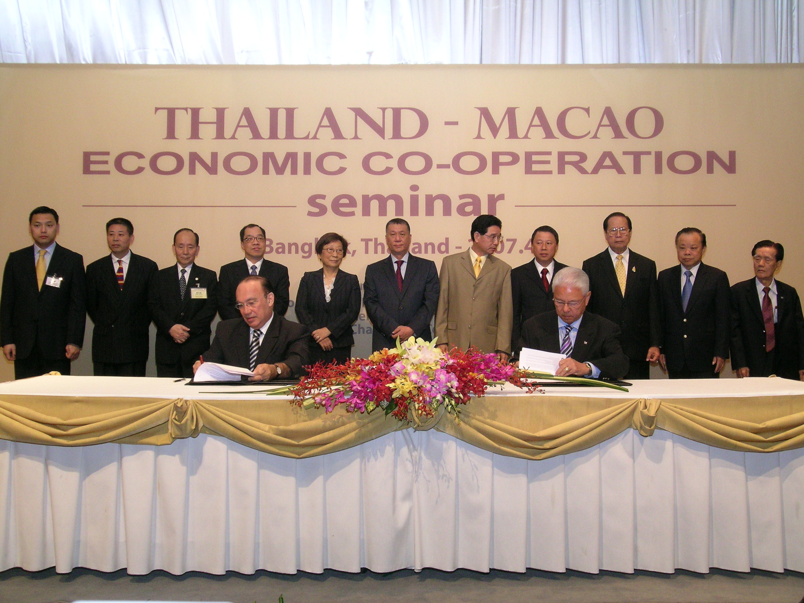 簽署儀式在“泰國-澳門經貿合作研討會”開幕禮上舉行,澳門特別行政區政府旅遊局局長安棟樑和泰國會議展覽局局長Kajit Habanananda代表簽署。