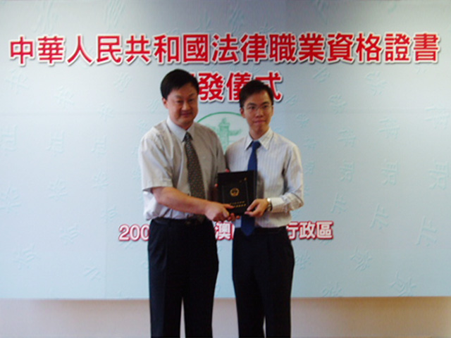 出席頒發證書儀式的有國家司法考試司綜合處孫曉明處長、國家司法考試中心考務處夏露處長、法務局張永春局長以及中國法律服務(澳門)公司張毅力總經理。頒發儀式上孫曉明處長鼓勵更多的澳門居民參加及通過國家司法考試。