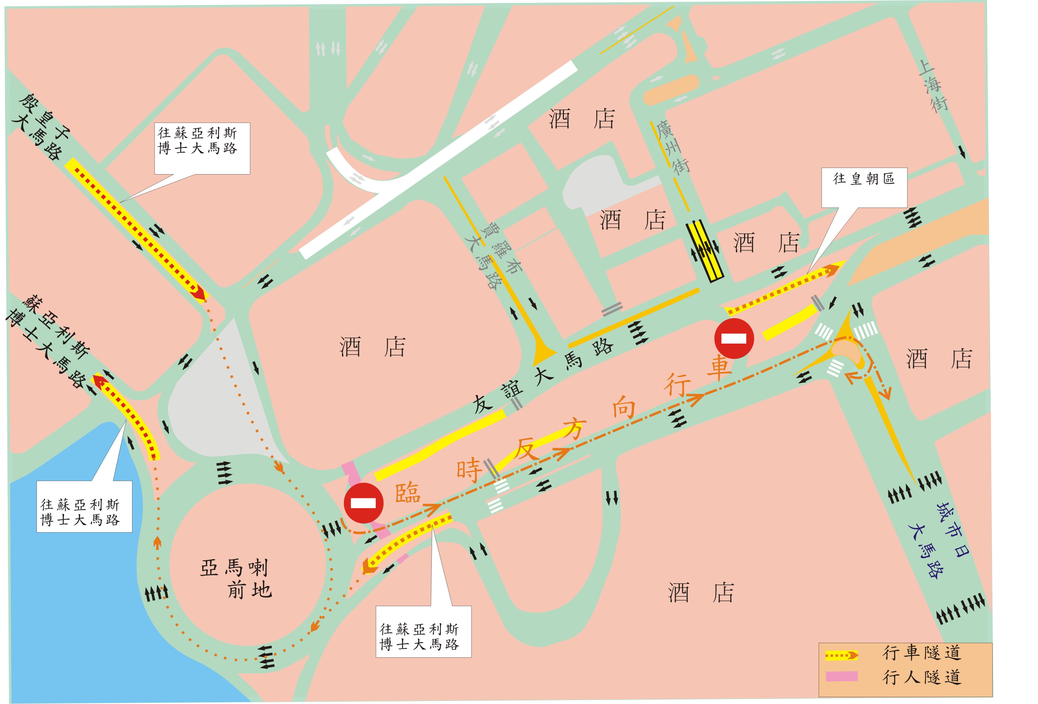 為確保大賽車舉行期間周邊道路有足夠疏道交通的能力,土地工務運輸局將在多條道路實施臨時交通改動,其中由下周一(十二日)早上十時起,介乎亞馬喇前地與城市日大馬路之間,位於藝園南面的路段將由單向行車改為雙向行車;同時將封閉廣州街對開及近亞馬喇前地的兩條中央調頭車道。另外由下周四(十四日)早上十時開始,介乎澳電大樓與母親會大廈之間的一段新雅馬路實施反方向行車,即由亞馬喇馬路往福海花園方向,來自馬交石砲台馬路(近澳電大樓)的車輛須繞行螺絲山公園後才能轉往亞馬喇馬路。上述臨時交通改道措施將直至本月十八日大賽車結束為止,屆時相關路段將恢復原來的行車運作。
