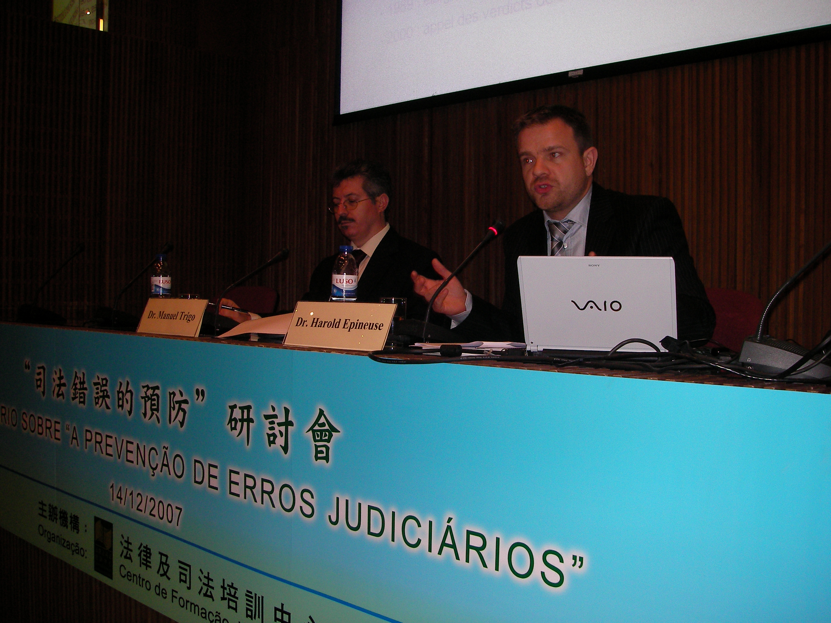 澳門特區法律及司法培訓中心於上周五(12月14日)下午3時至5時半假公共行政大樓地庫演講廳舉行“司法錯誤的預防”研討會,邀請巴黎高級司法研究所高級司法研究國際聯盟主任Harold Epineuse先生來澳擔任主講嘉賓。研討會以法語進行,並輔以廣東話及葡語同聲傳譯,共有一百多人參加,包括特區的司法官、司法官培訓課程實習員、律師、實習律師及公共行政部門的法律人員。