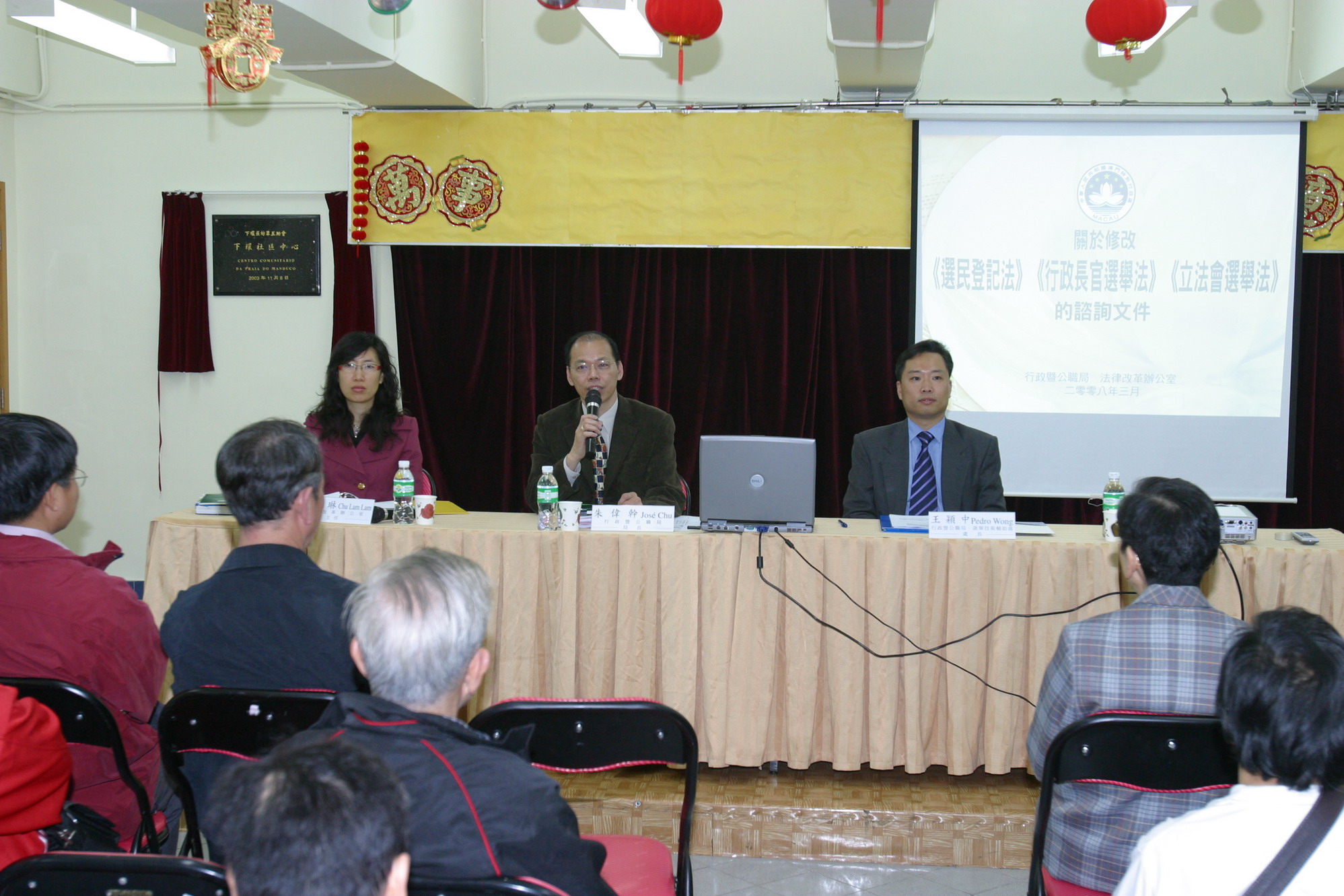 應澳門街坊總會的邀請,行政暨公職局和法律改革辦公室今天(3月14 日星期五)晚上八時半在下環社區中心向該區居民講解修改《選民登記法》、《行政長官選舉法》和《立法會選舉法》諮詢文本的內容。會上行政暨公職局朱偉幹局長、法律改革辦公室朱琳琳主任和選舉技術輔助處王穎中代處長向與會者介紹文本內各項建議的具體方案,並回答與會者提出的問題。