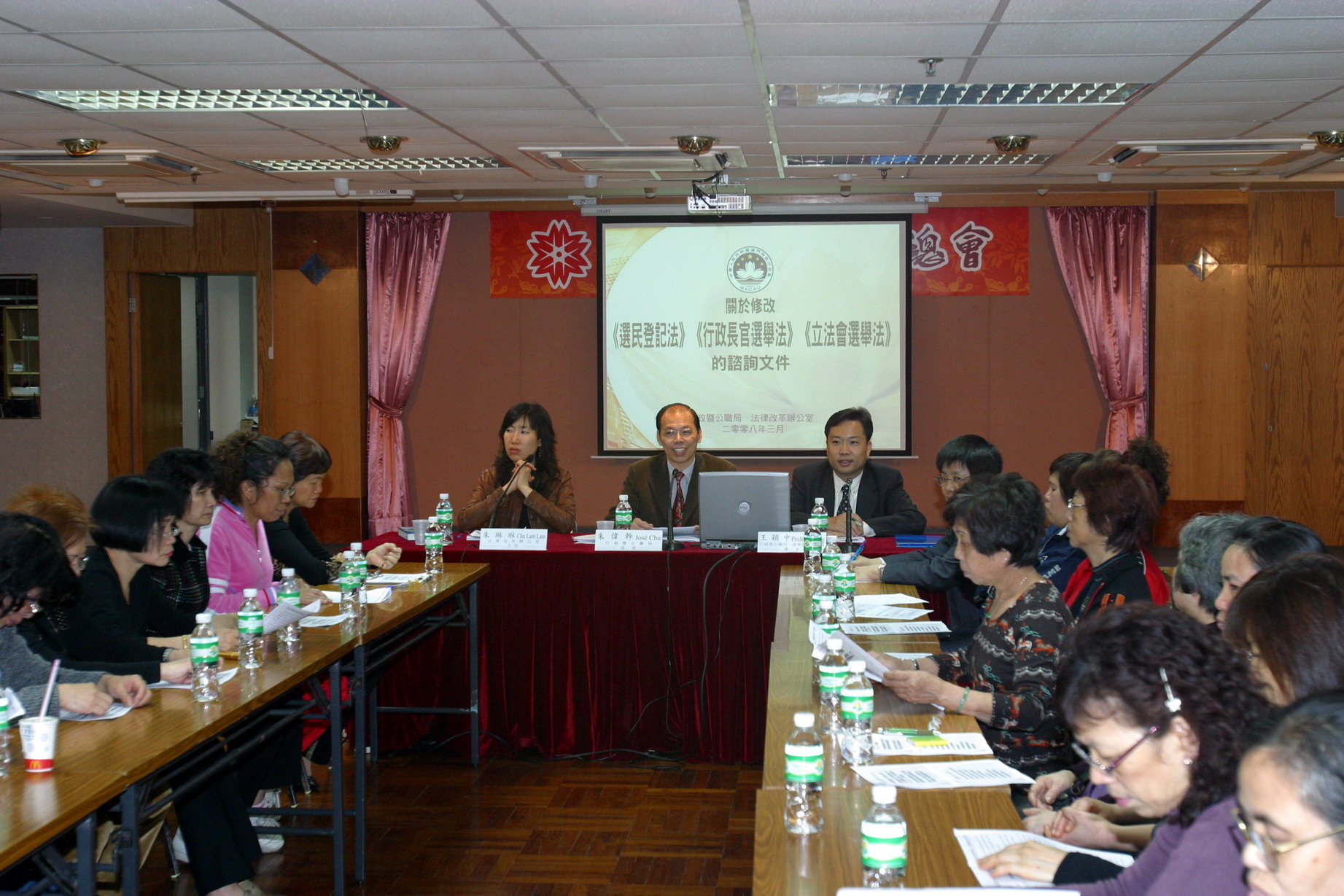 應婦女聯合總會的邀請,行政暨公職局和法律改革辦公室今天(3月20 日星期四)下午七時半在婦聯大廈二樓婦聯綜合服務中心向該會百多名負責人、工作人員及會員講解修改《選民登記法》、《行政長官選舉法》和《立法會選舉法》諮詢文本的內容。會上行政暨公職局朱偉幹局長、法律改革辦公室朱琳琳主任和選舉技術輔助處王穎中代處長向與會者介紹文本內各項建議的具體方案,並回答與會者提出的問題。