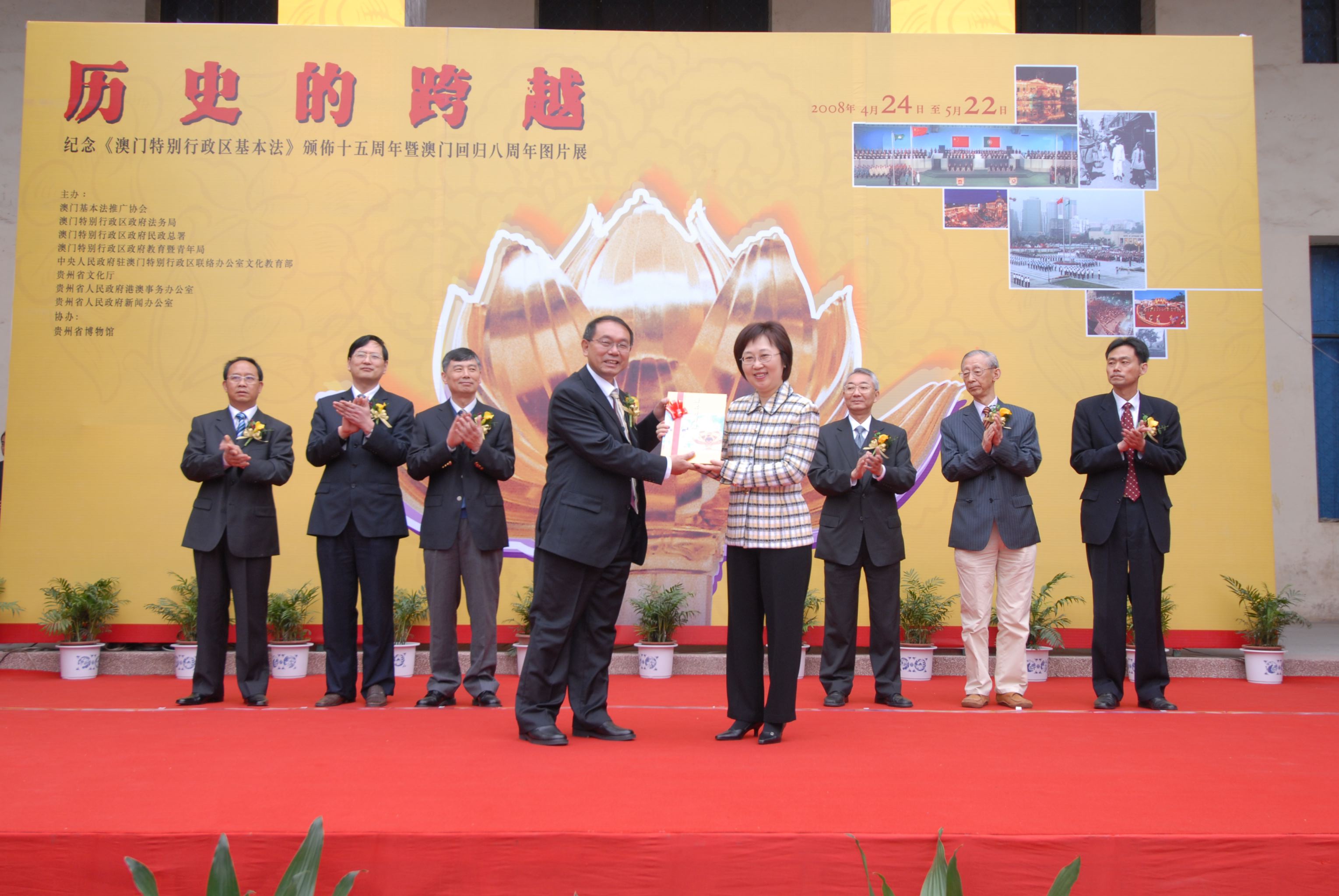 “歷史的跨越──紀念《澳門特別行政區基本法》頒佈十五週年暨澳門回歸八週年圖片展”由澳門基本法推廣協會、澳門特別行政區政府法務局、民政總署、教育暨青年局、中央人民政府駐澳門特別行政區聯絡辦公室文化教育部、貴州省港澳事務辦公室、貴州省文化廳主辦,並由貴州省博物館承辦,於四月二十五日至五月二十二日在貴州省博物館舉行,共展出近四百張圖片,介紹澳門社會的變遷和歷程。圖片展已先後在北京、廣州、上海、長沙、重慶、昆明、福州、江蘇、江西、廣西等地巡迴展出,反應熱烈。