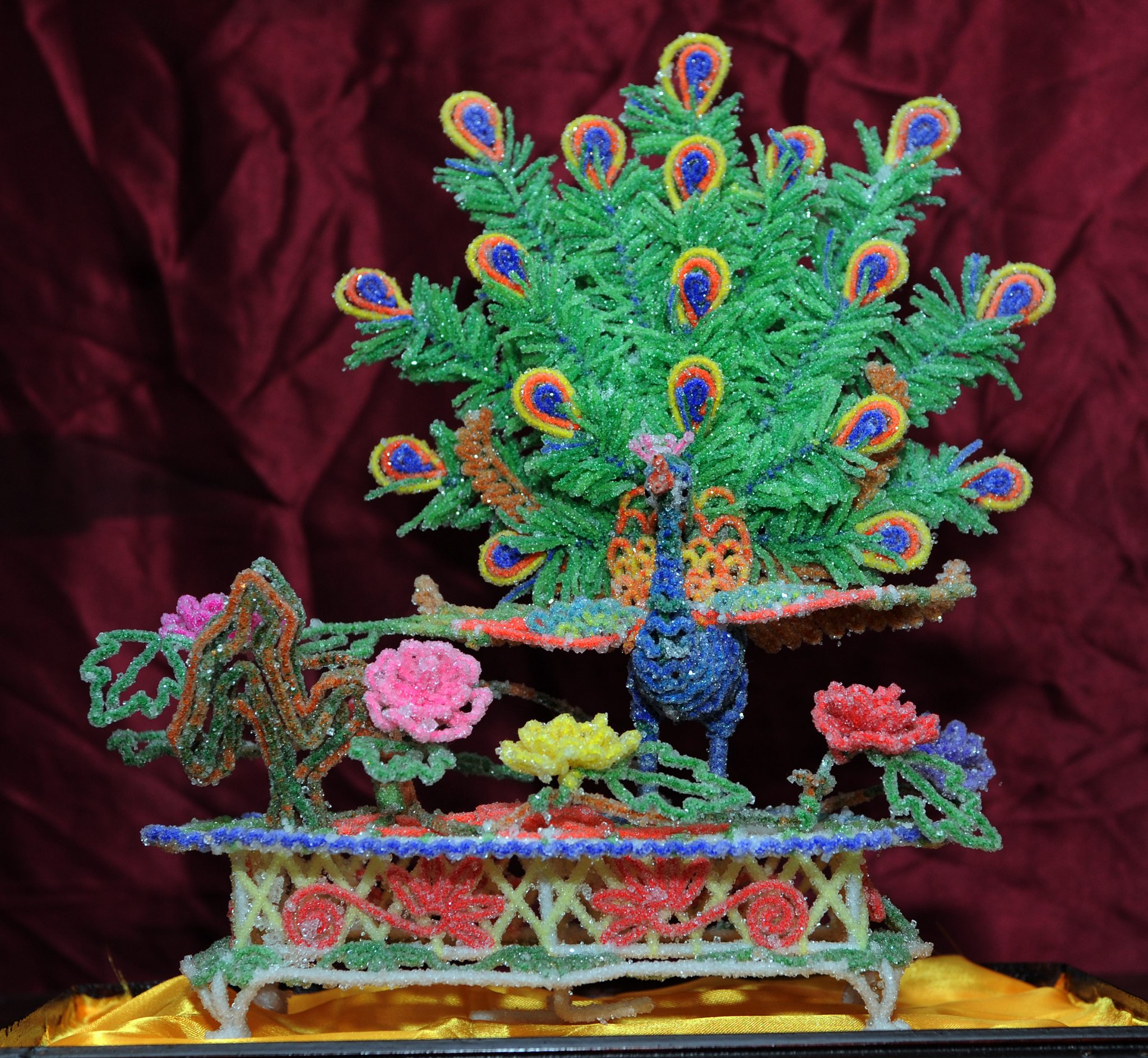 被列入浙江省“非物質文化遺産保護名錄”的礬塑,是由盛產明礬的浙江蒼南縣人民,利用自然礦產資源明礬所創作的一種特色工藝,製作時先以銅絲製成骨架,輔以彩色絲線等製成半成品,又常以紅、綠強烈對比來展現色澤豔麗之美,使其色彩鮮豔奪目,最後利用明礬浸泡,即成晶瑩剔透、美麗多姿的工藝品。