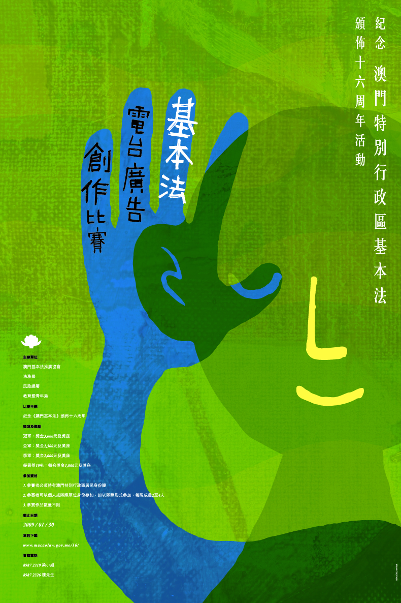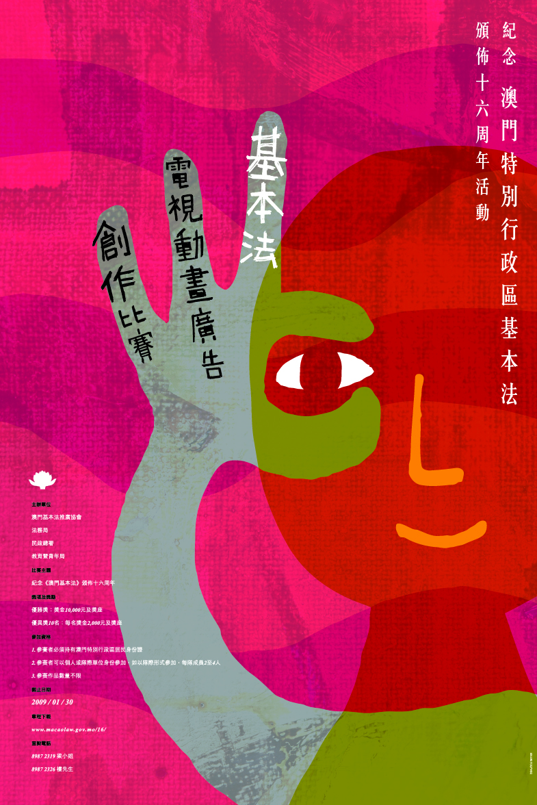 明年是《澳門特別行政區基本法》頒佈十六周年,澳門基本法推廣協會、法務局、民政總署及教育暨青年局將繼續舉辦一系列活動,包括研討會、園遊會、基本法與特區法律問答比賽、攤位遊戲設計比賽、報章遊戲等等。為系列活動率先揭開序幕的,分別有“基本法電視動畫廣告創作比賽”及“基本法電台廣告創作比賽”,希望藉著這兩項比賽,鼓勵更多市民參與推廣《澳門基本法》的活動,並發揮創意,創作出配合主題、創意新穎的電視動畫廣告和電台廣告。